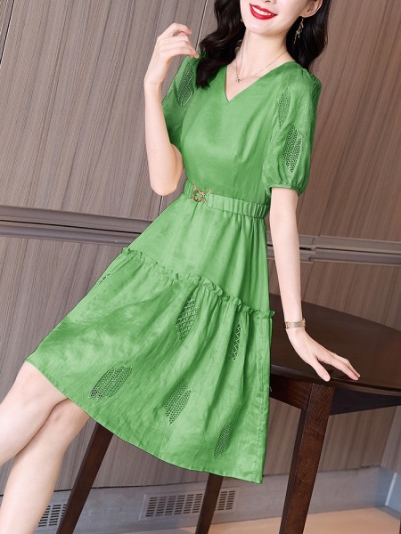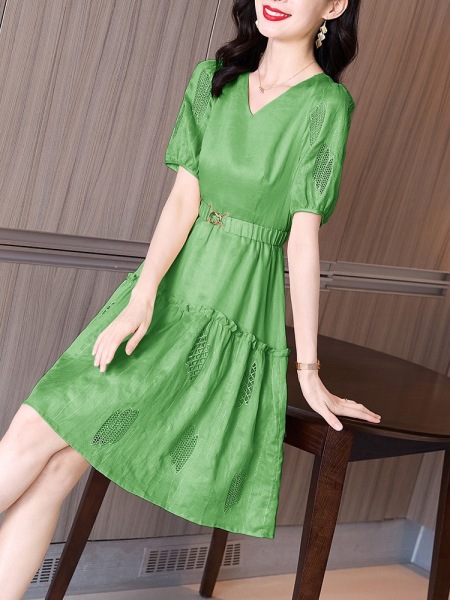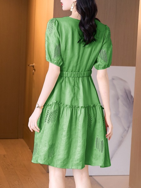 TR22720# 欧货新款夏装超仙气小清新小个子显高收腰显瘦v领绿色连衣裙 服装批发女装服饰货源