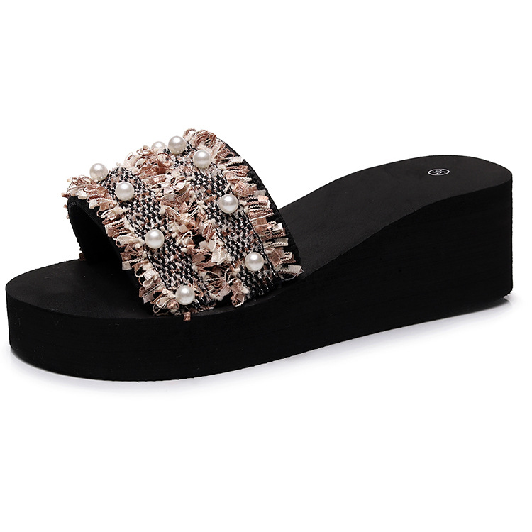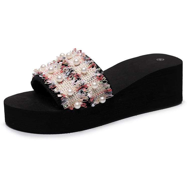 X-30097# 新款凉拖女夏外穿时尚高跟厚底一字拖防滑串珠坡跟沙滩鞋海边拖鞋 鞋子批发女鞋货源