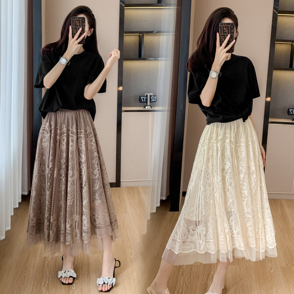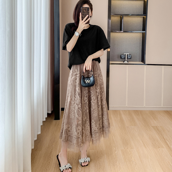 TR37440# 夏新款韩系显瘦别致蕾丝半身裙a字裙开叉短袖T恤两件套装 服装批发女装批发服饰货源
