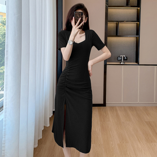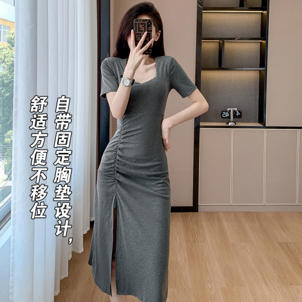 TR37442# 带胸垫夏新款V气质开叉连衣裙女褶皱性感修身中长款包臀裙 服装批发女装批发服饰货源