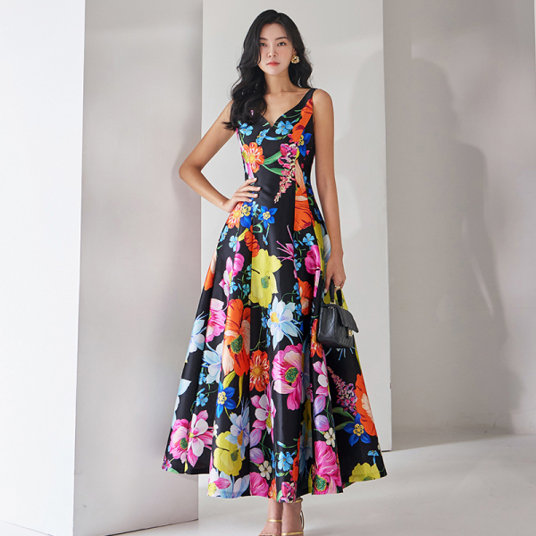 TR37824# 夏新款韩版时尚气质吊带印花高贵大气中长款大摆A字裙连衣裙 服装批发女装批发服饰货源