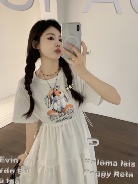 TR41967# 大码夏新款胖MM甜美兔子宽松设计感收腰少女T恤中长裙 服装批发女装批发服饰货源