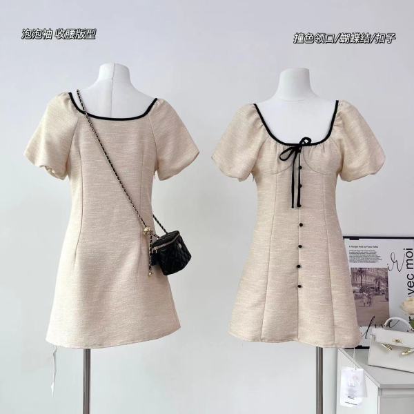 TR42520# 邱肉瑶夏季新款白色泡泡袖小香风连衣裙女v领收腰小个子裙子 服装批发女装批发服饰货源