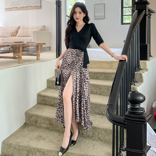 TR43308# 时尚豹纹印花拼接连衣裙一片式围裹裙春秋新款长裙 服装批发女装批发服饰货源