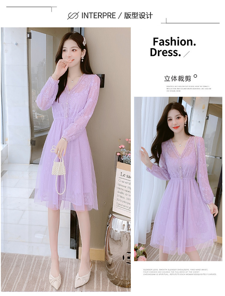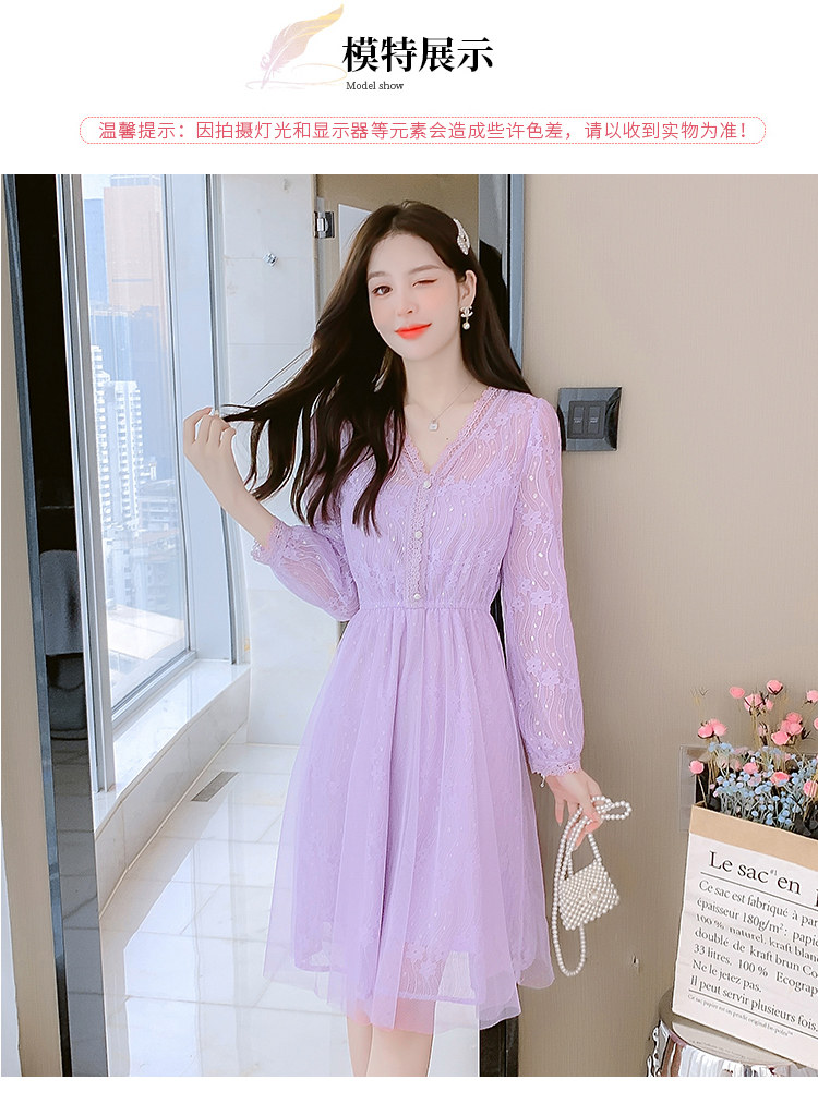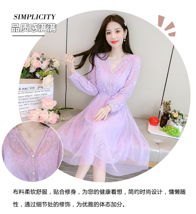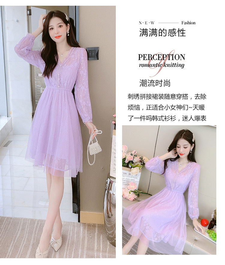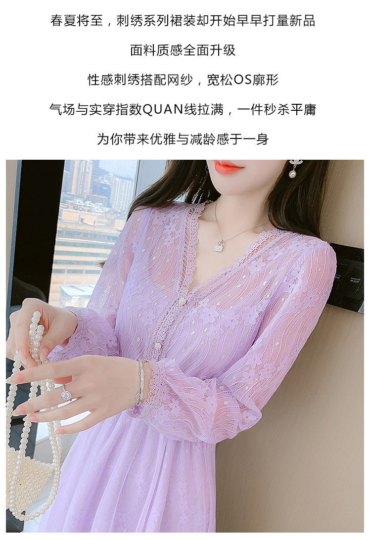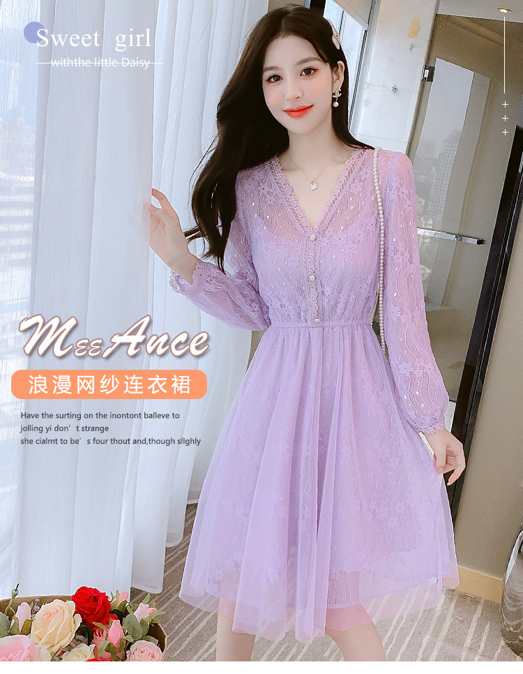 TR49381# 法式v领蕾丝连衣裙春新款潮收腰显瘦气质仙女长 服装批发女装批发服饰货源