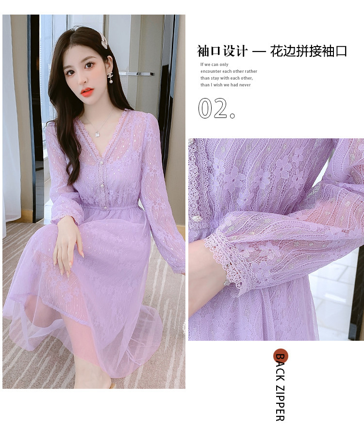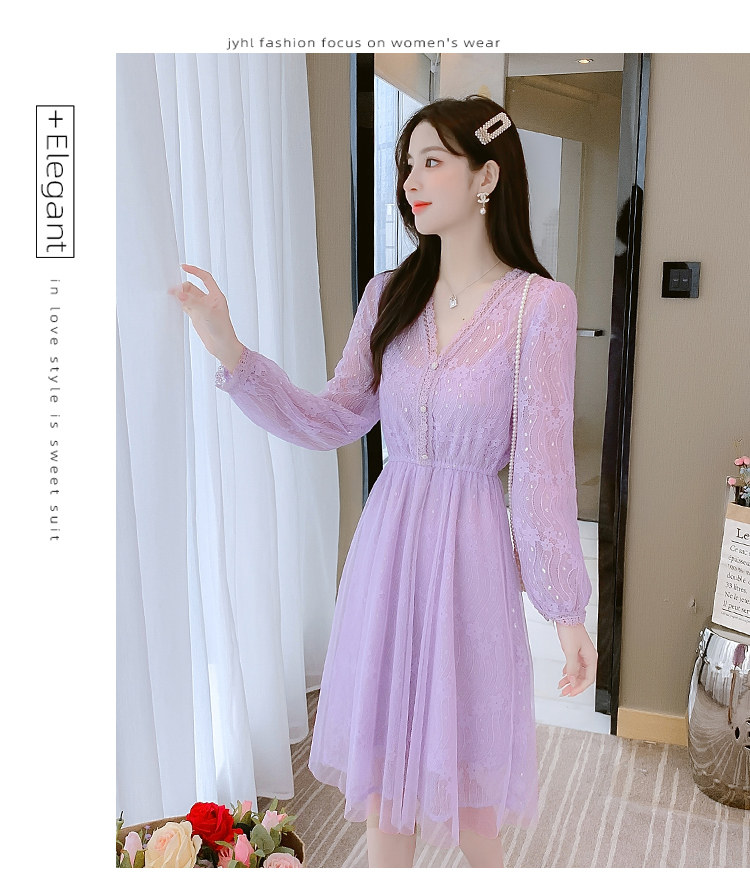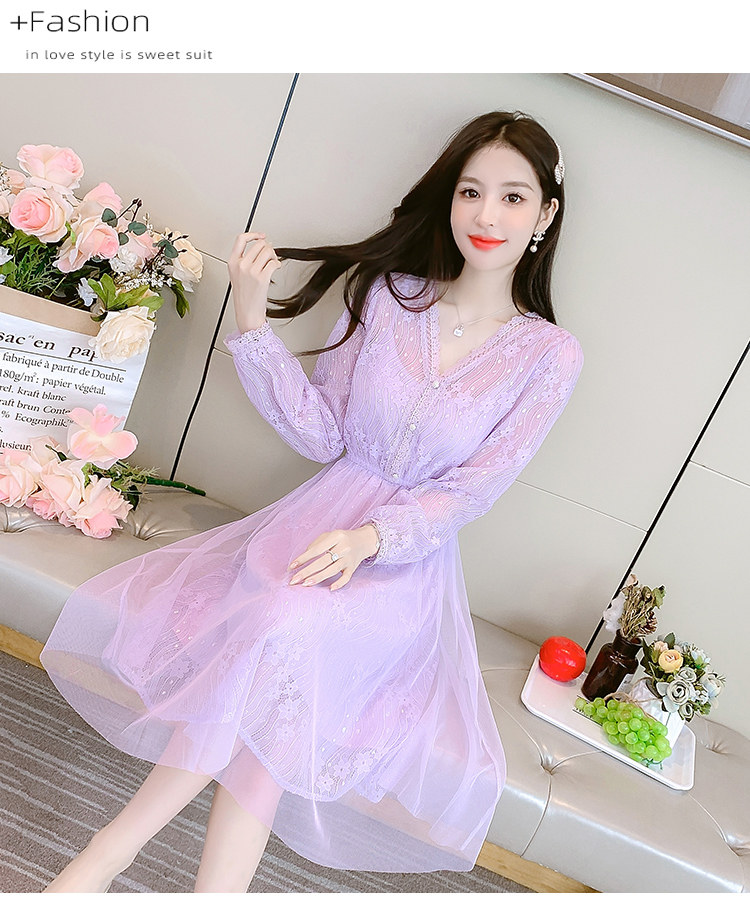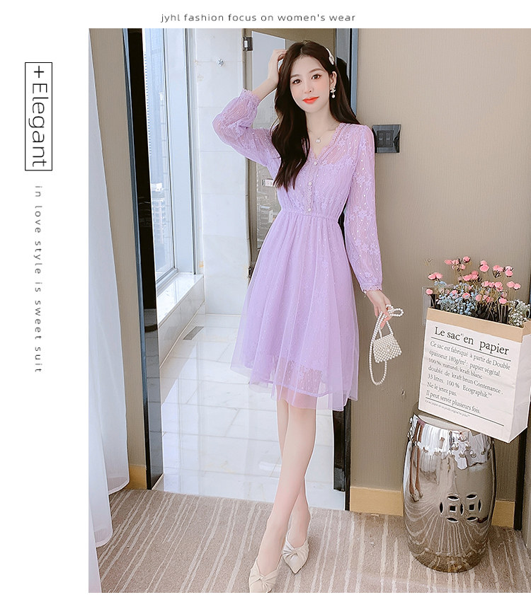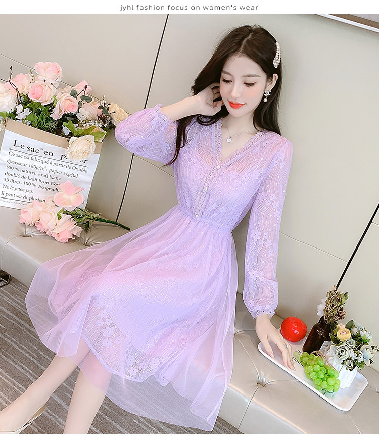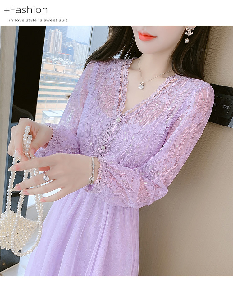 TR49381# 法式v领蕾丝连衣裙春新款潮收腰显瘦气质仙女长 服装批发女装批发服饰货源