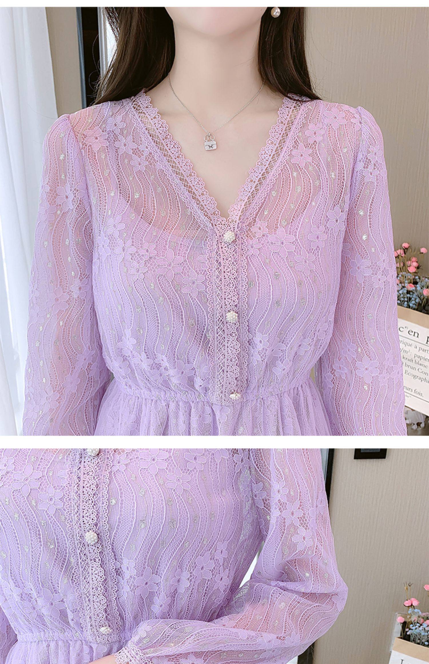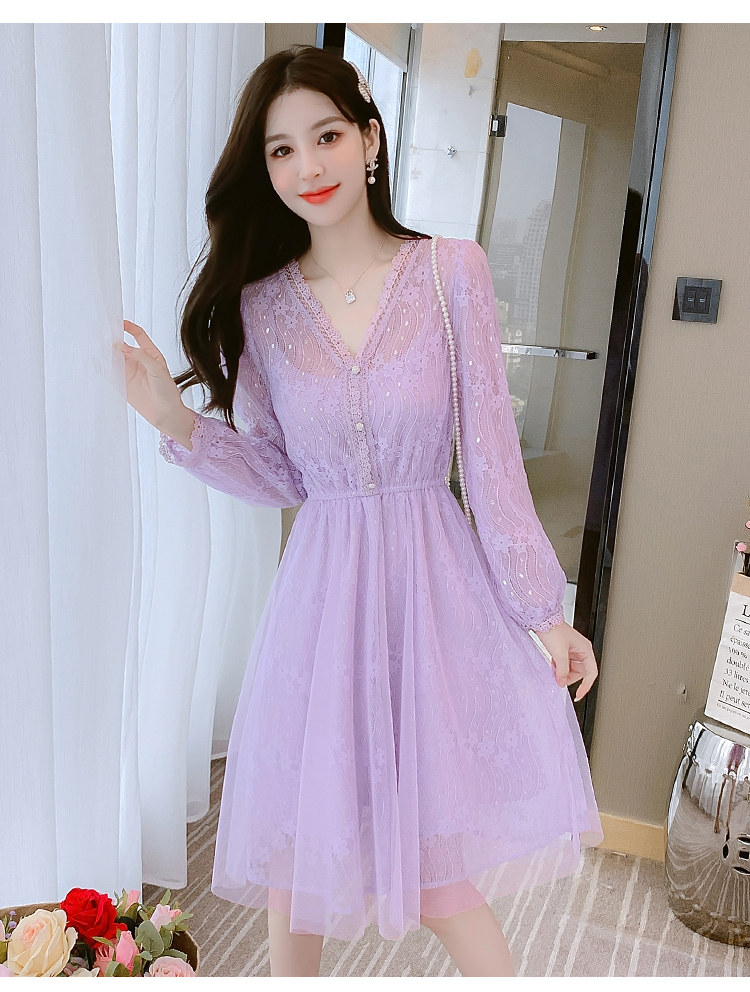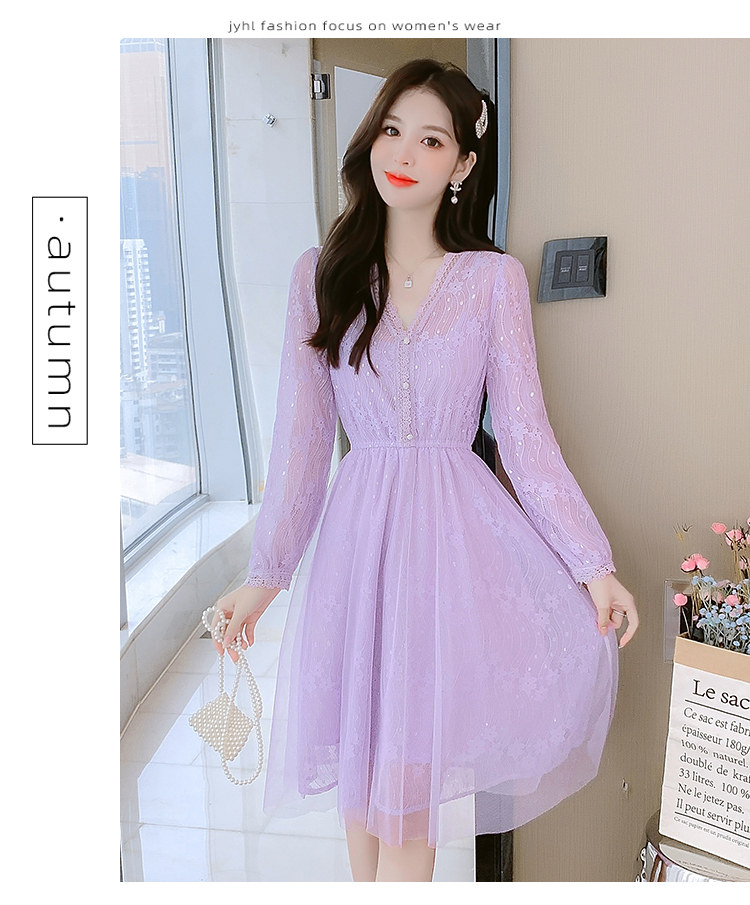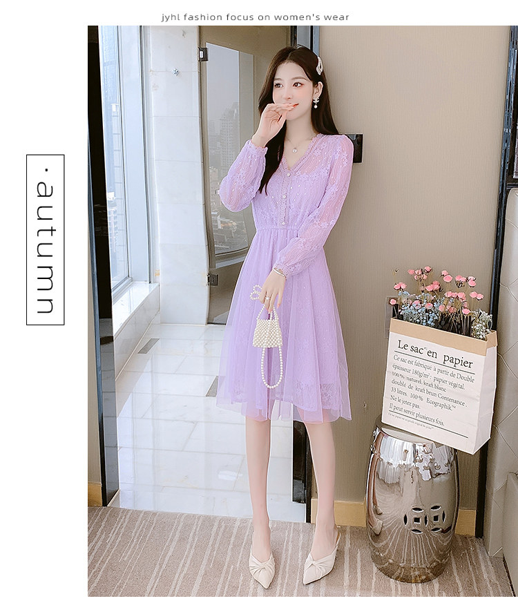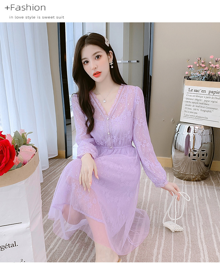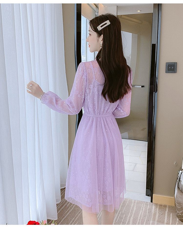 TR49381# 法式v领蕾丝连衣裙春新款潮收腰显瘦气质仙女长 服装批发女装批发服饰货源