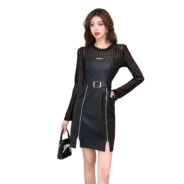 TR51086# 小个子吊带PU皮裙连衣裙女秋季港味洋气减龄炸街两件套装 服装批发女装批发服饰货源