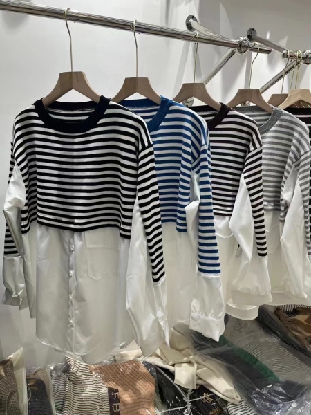TR53375# 假两件卫衣女款长袖秋季新款爆款宽松拼接条纹别致春秋上衣女 服装批发女装批发服饰货源