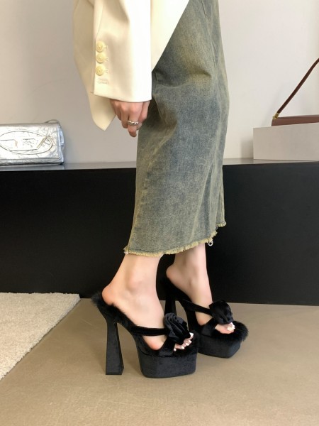 X-30491# 巨显腿长~玫瑰花朵兔毛防水台高跟鞋秋冬轻奢气质名媛凉拖鞋女 鞋子批发女鞋货源