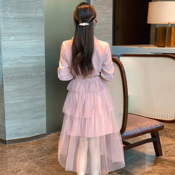 TR56138# 新款西装领珍珠扣拼接网纱蛋糕裙气质连衣裙女 服装批发女装批发服饰货源