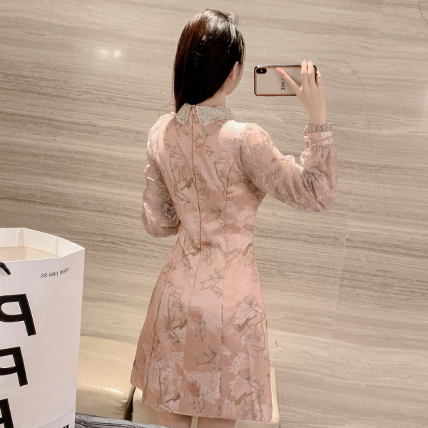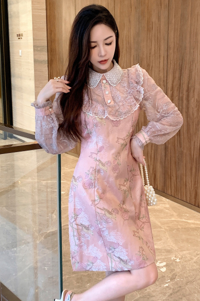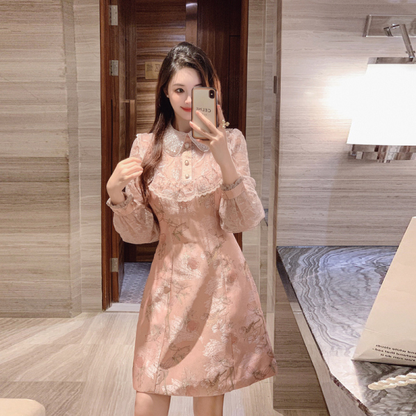 TR56141# 小香风秋季气质提花娃娃领收腰显瘦粉色连衣裙 服装批发女装批发服饰货源