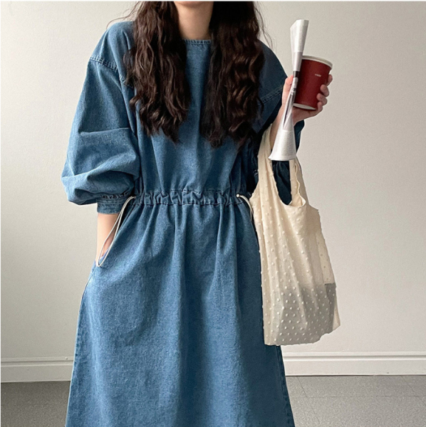 TR58489# 韩国chic春秋季复古慵懒风圆领抽绳系带收腰大摆型仿牛仔连衣裙女 服装批发女装批发服饰货源
