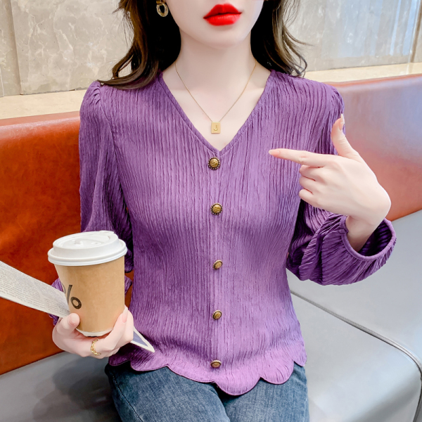 TR58852# 秋季新款时尚气质休闲长袖V领波浪下摆百搭衬衫上衣 服装批发女装批发服饰货源