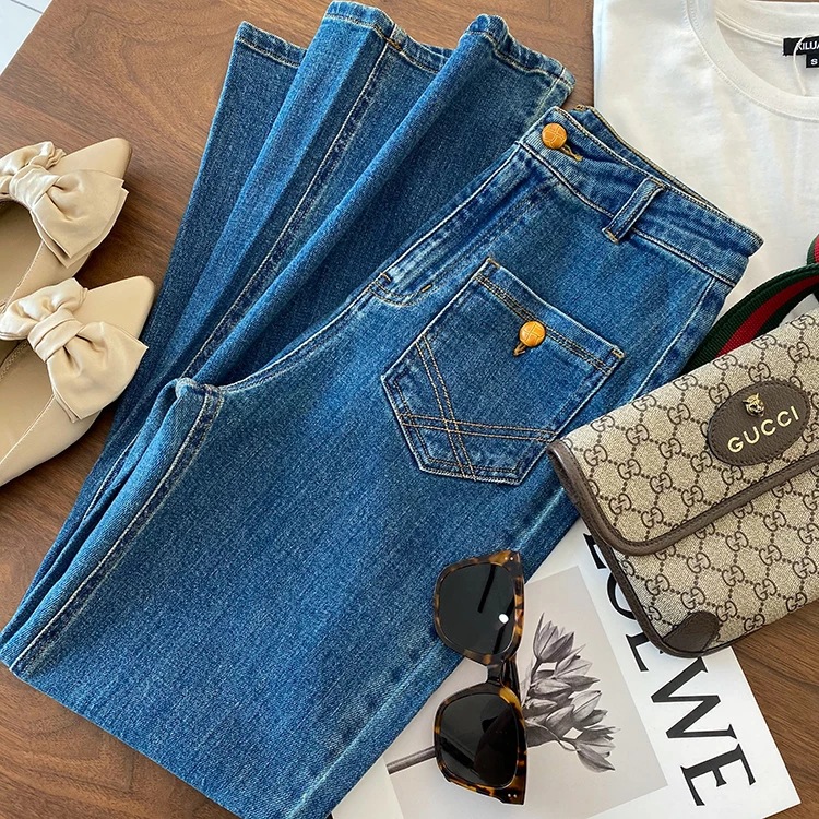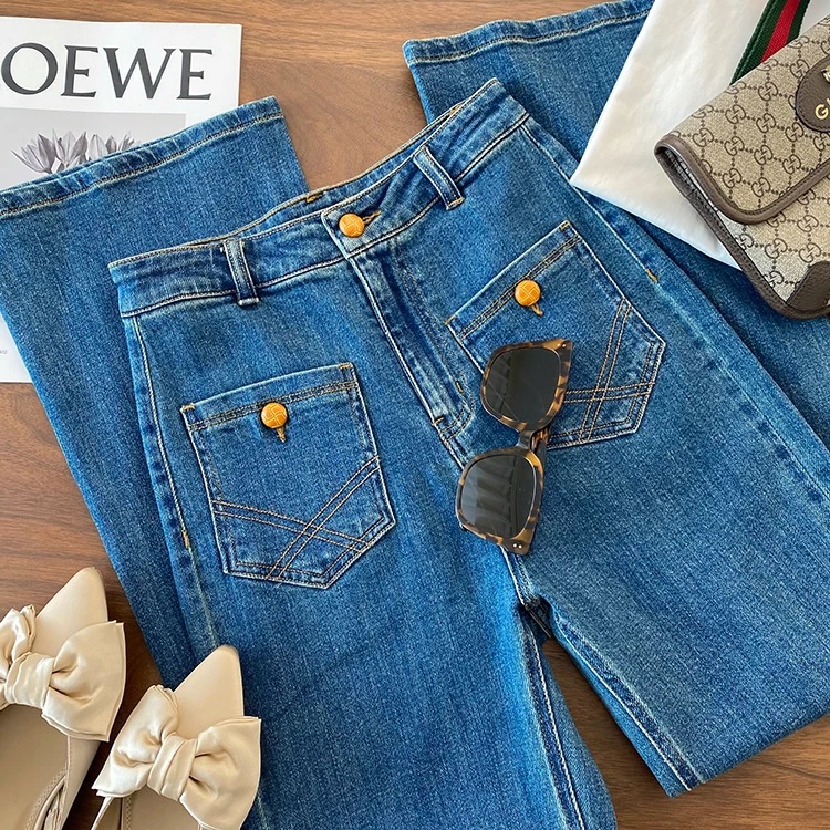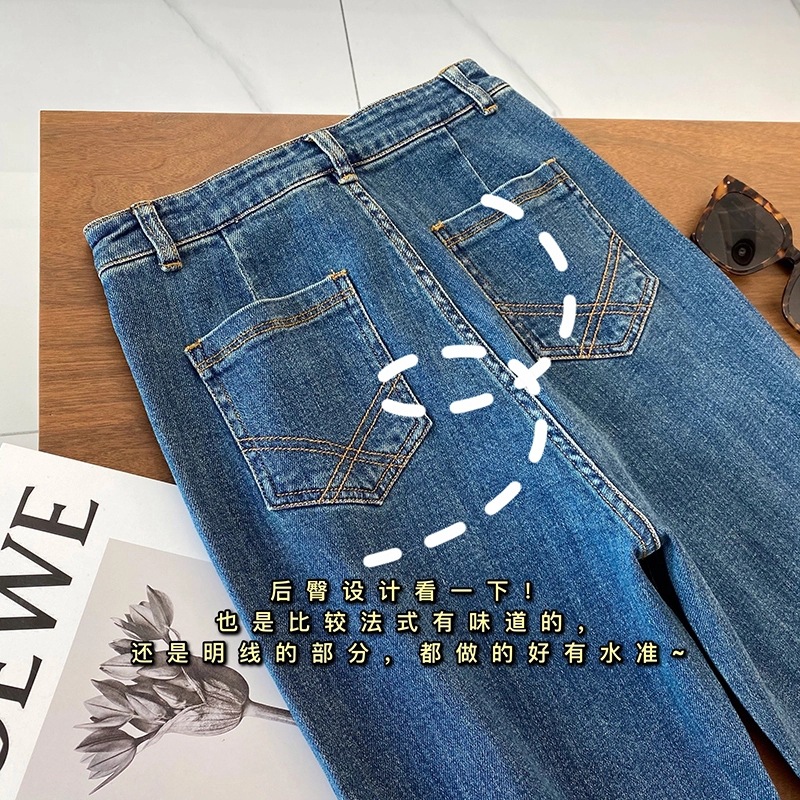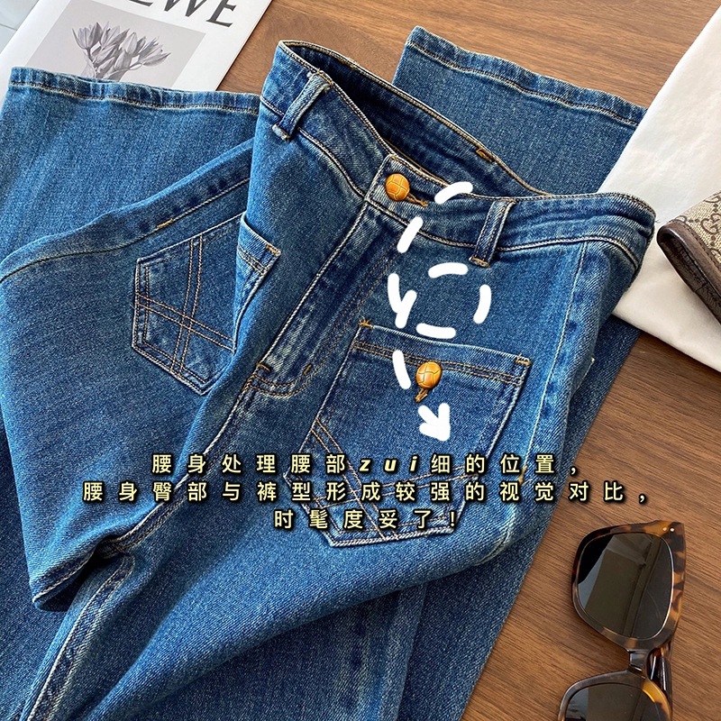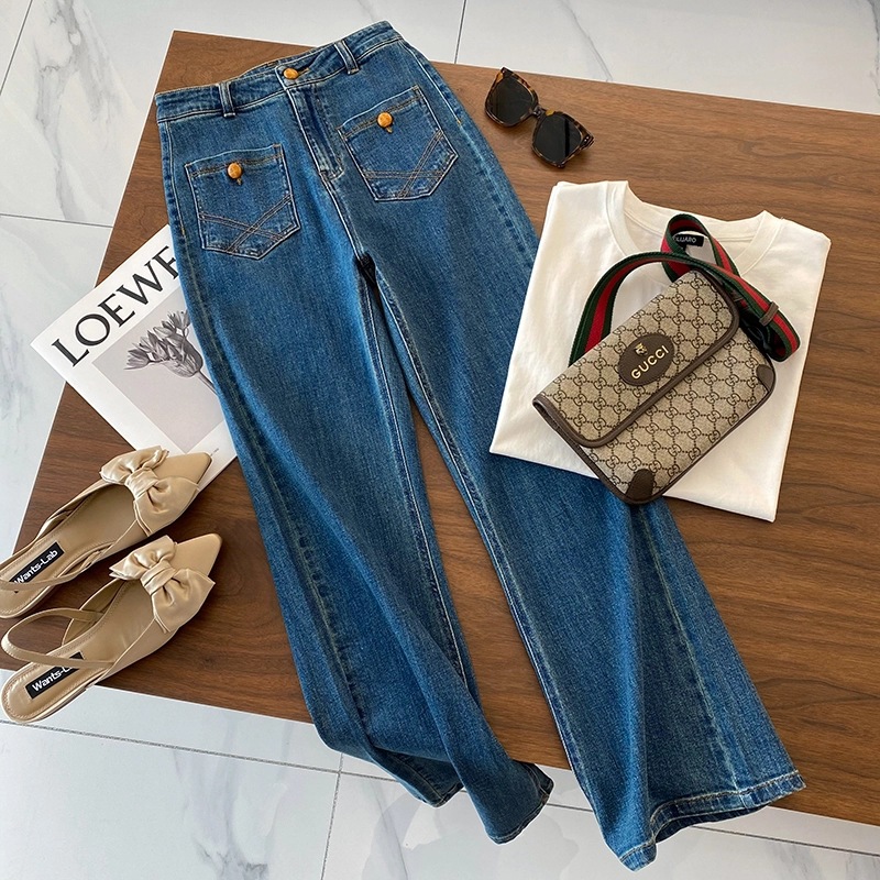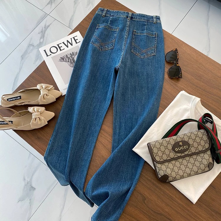 TR60561# 春秋法式复古高腰前口袋微喇牛仔裤女高腰chic直筒宽松阔腿拖地裤