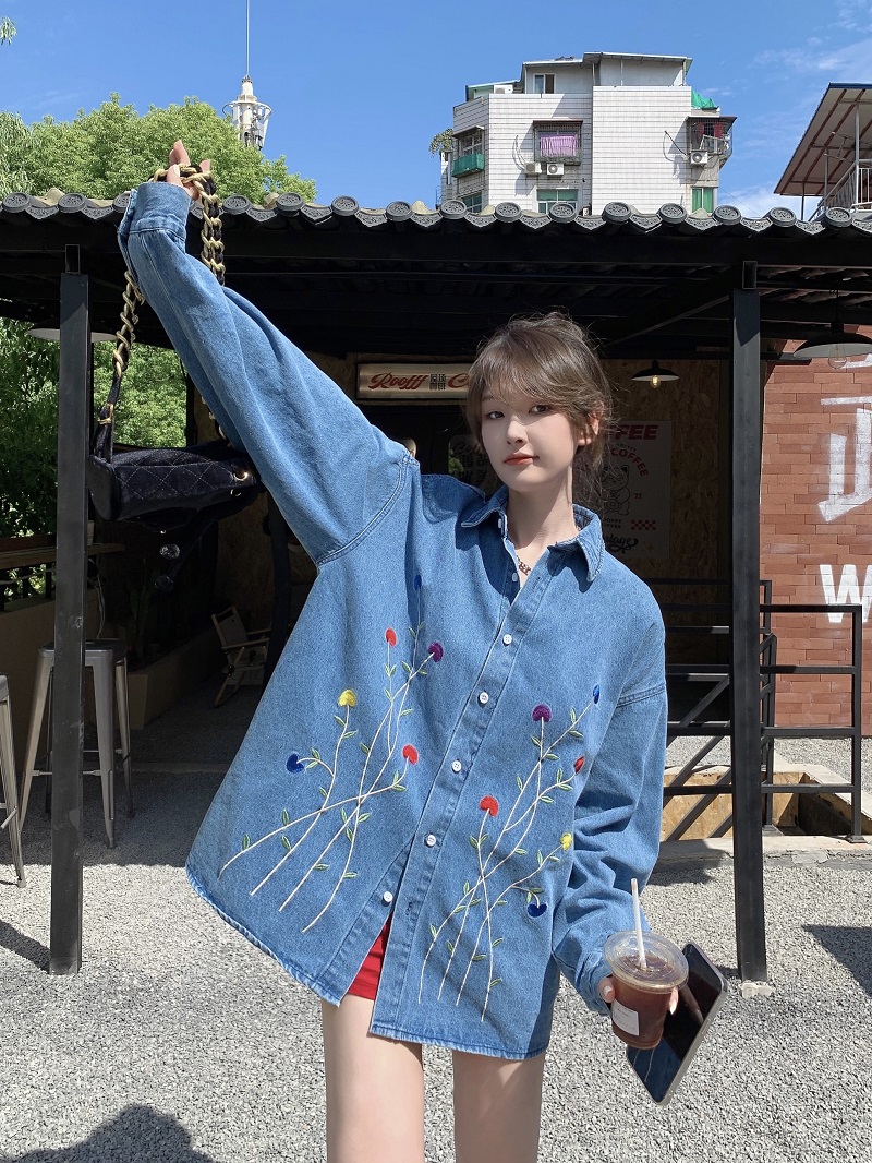 TR60831# 韩版复古藤蔓刺绣牛仔衬衫女新款早秋宽松设计感上衣外套