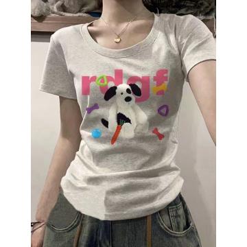 CX11024# 最便宜服装批发 纯棉精梳紧密带弹力 印花修身短袖t恤女