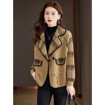 TR66569# 西装领羊绒外套女短款毛呢大衣秋冬新款外搭毛衣开衫绿色格子上衣 服装批发女装批发服饰货源
