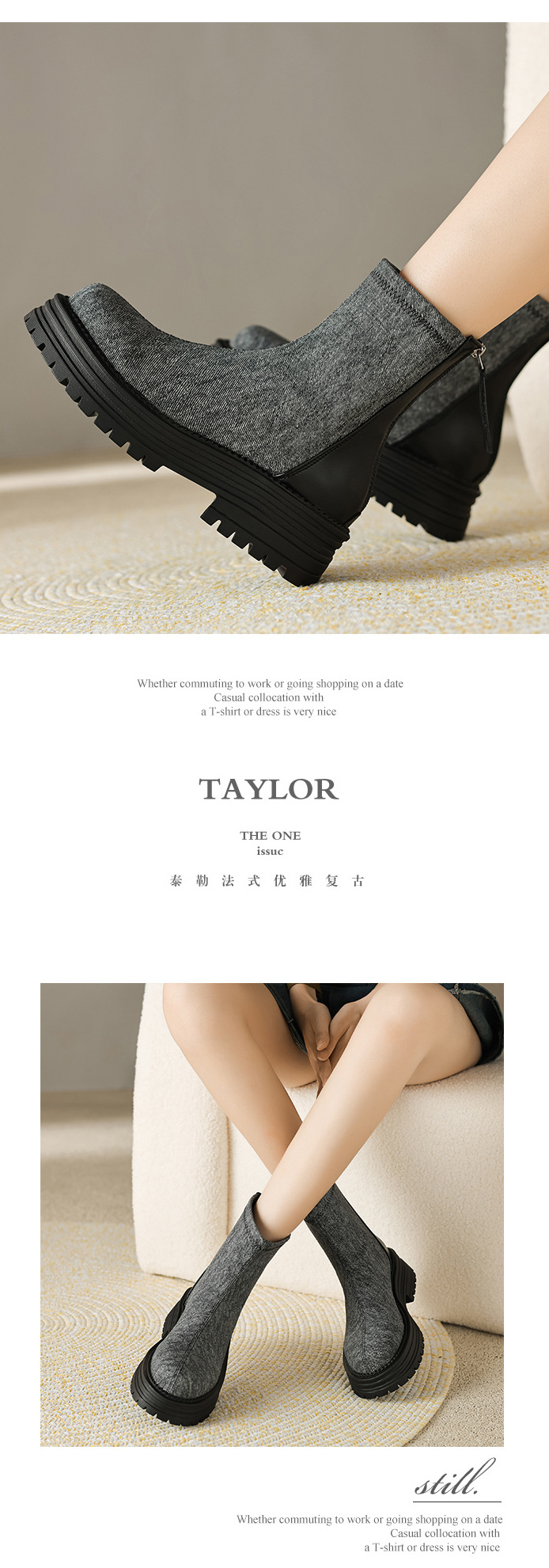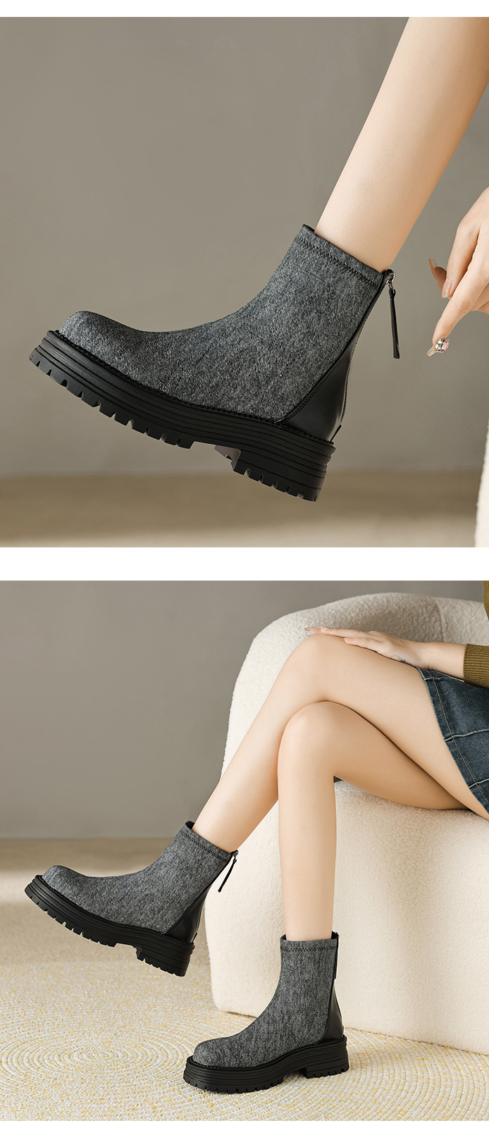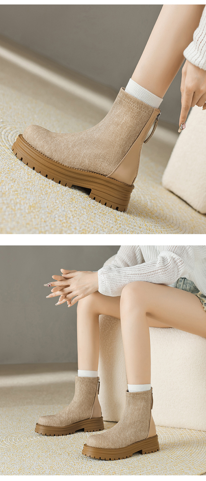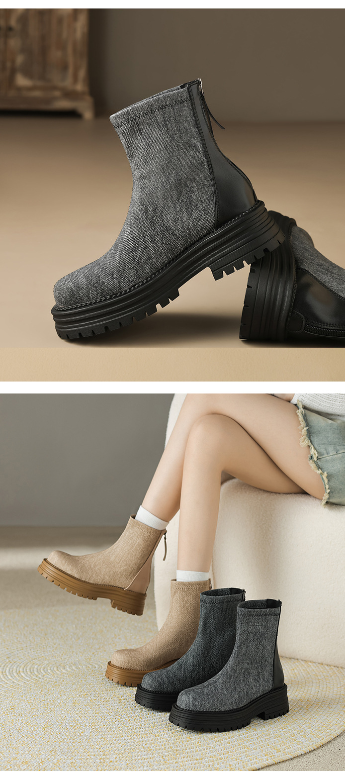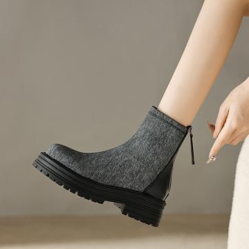 X-30785# 圆头防水台拼接短筒靴子秋冬新款松糕跟后拉链马丁靴女批发 鞋子批发女鞋货源