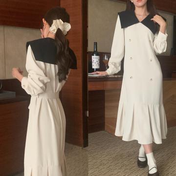 TR68083# 温柔气质撞色大翻领双排扣收腰系带鱼尾连衣裙 服装批发女装批发服饰货源
