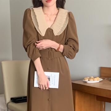 TR68084# 法式复古双层风琴褶拼接单排扣收腰系带长款连衣裙 服装批发女装批发服饰货源