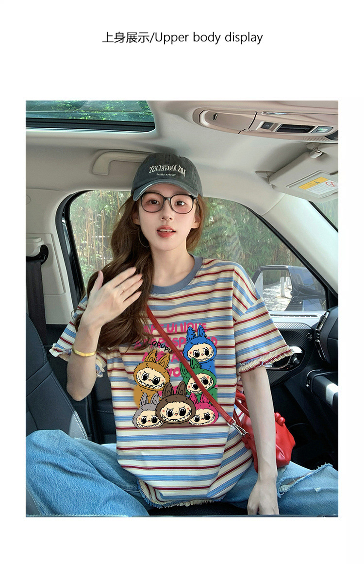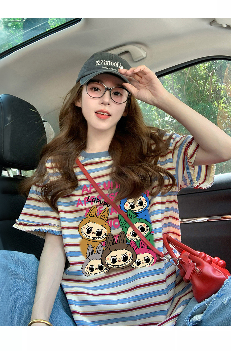 Home > 短袖T恤 > FA37016# 小众独特撞色条纹纯棉T恤女ins韩系拉布布涂鸦宽松时尚遮肚子上衣 服裝批發女裝批發服飾貨源