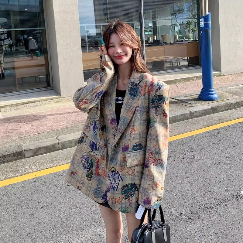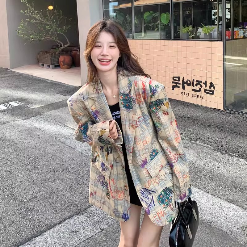 FA41913# 涂鸦印花小西装外套女秋季韩系设计感休闲时尚小个子炸街西服 服裝批發女裝批發服飾貨源
