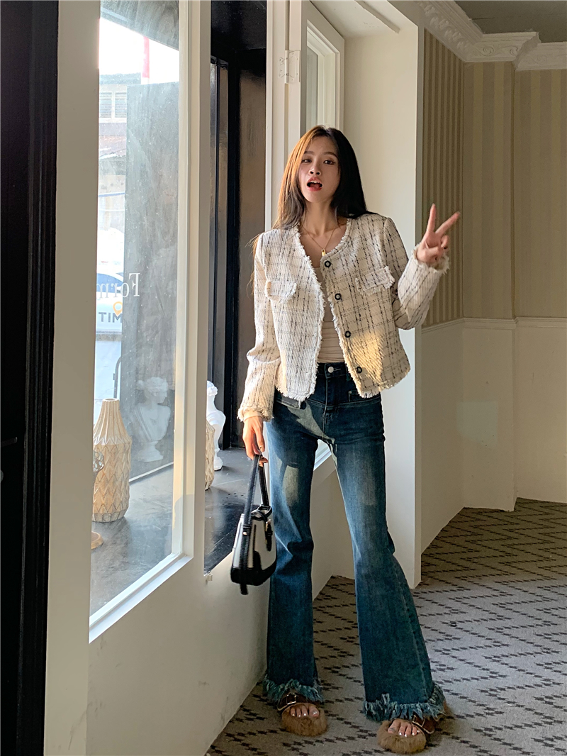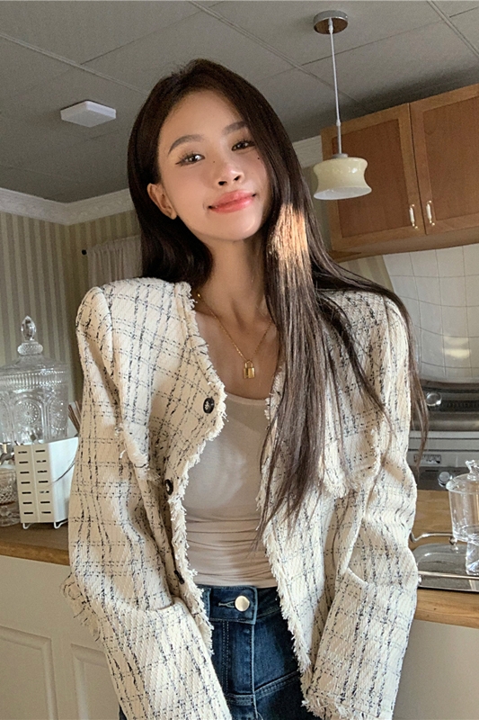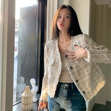 Home > 毛呢外套、粗呢外套 > FA42174# 春季新款气质复古小香风短款法式毛边长袖外套开衫上衣女chic