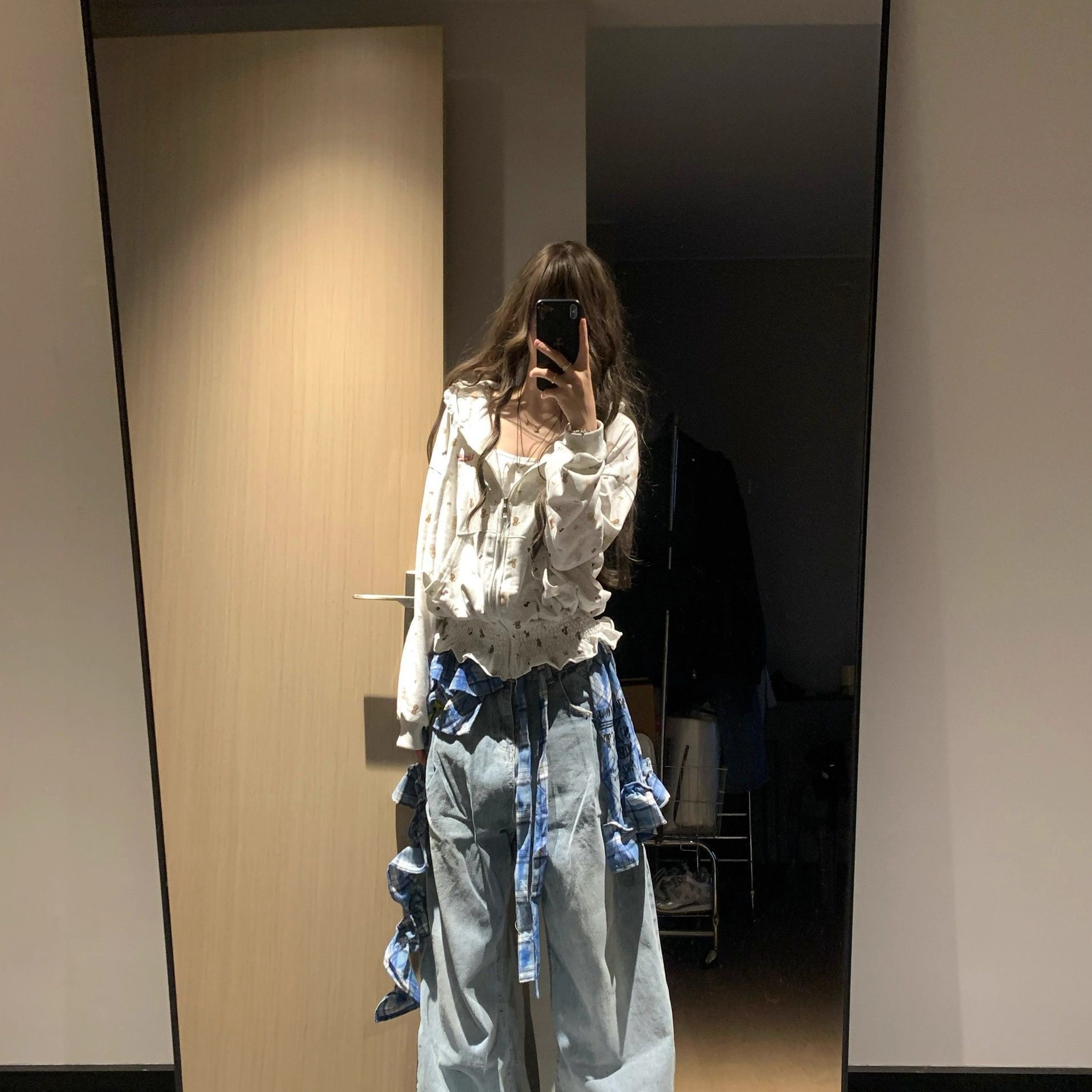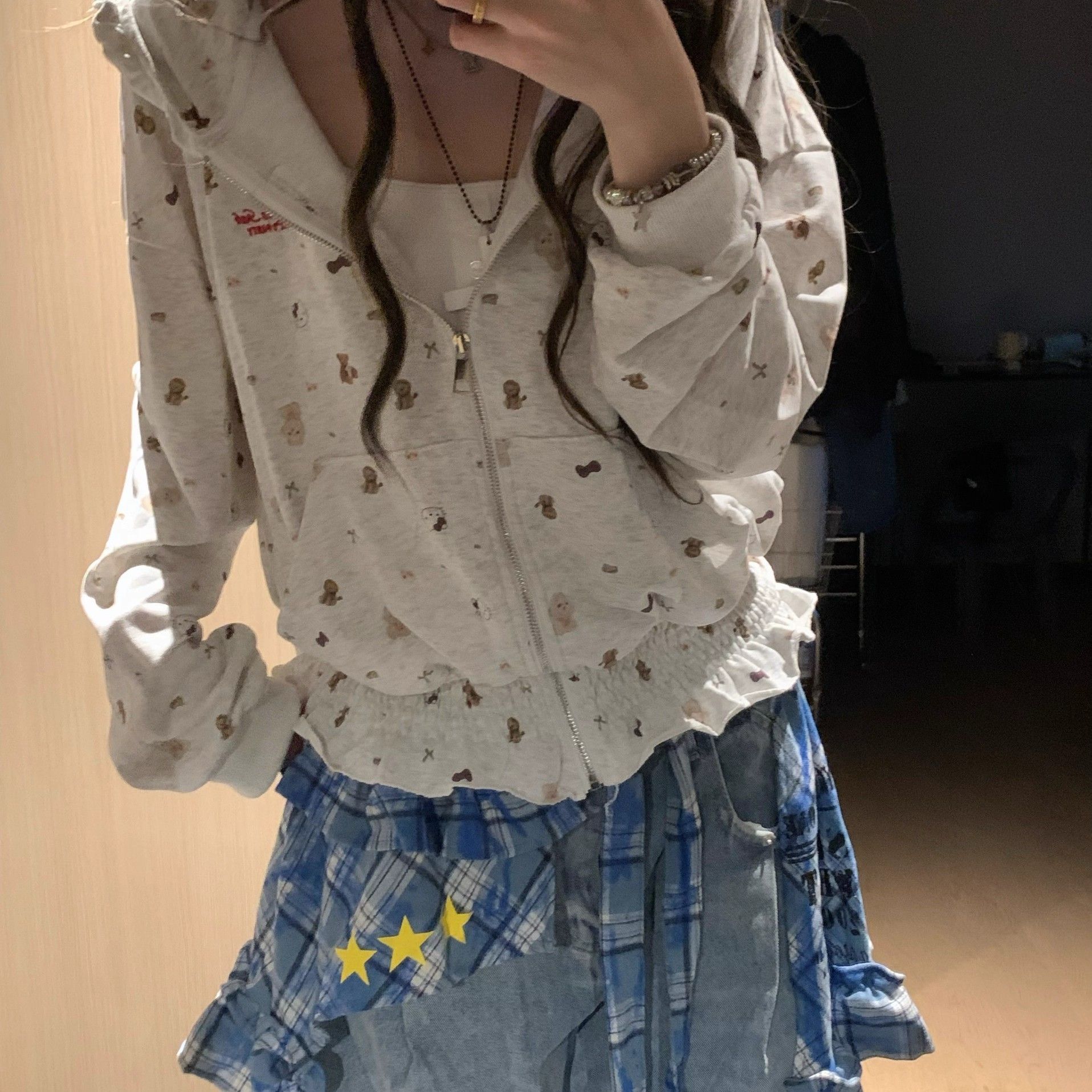 FA42598# 设计感小众美式复古碎花连帽卫衣女宽松休闲百搭开衫外套上衣秋潮 服裝批發女裝批發服飾貨源
