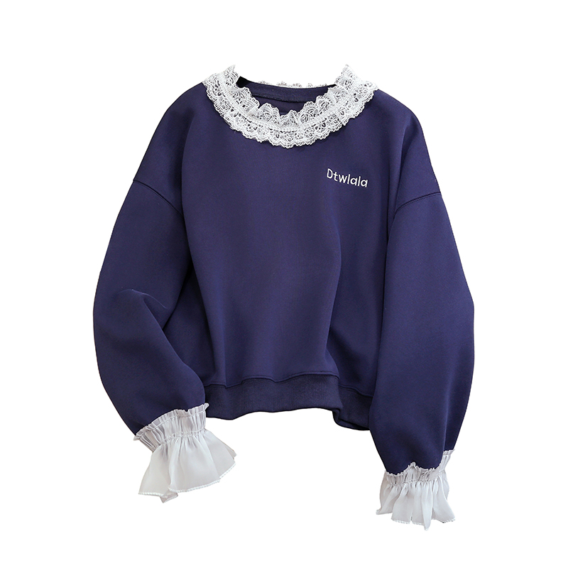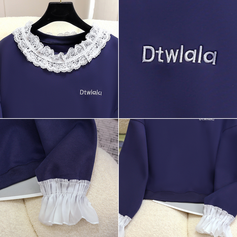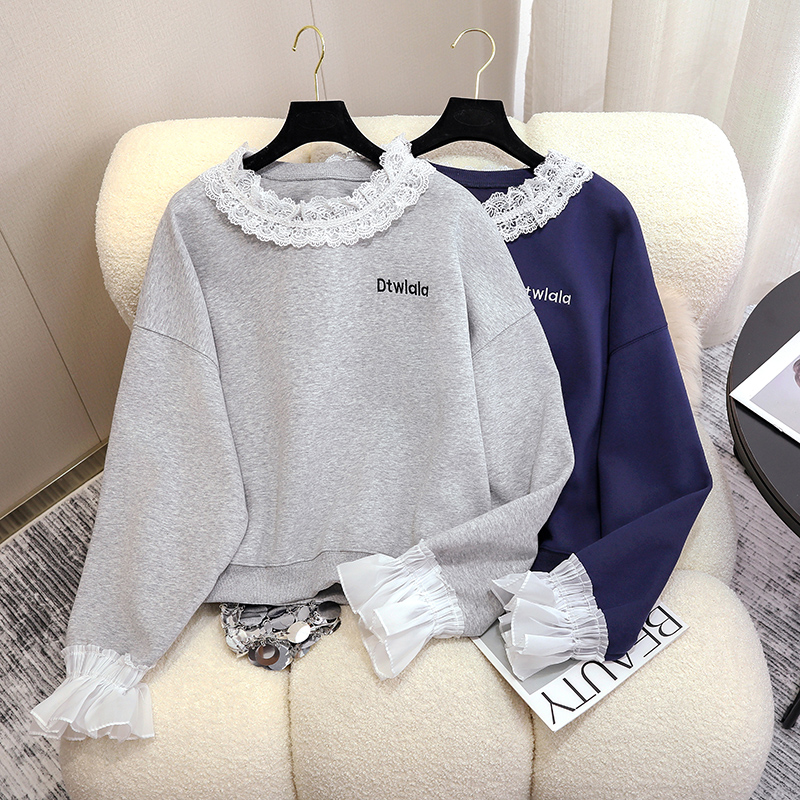 FA42730# 秋季新款时尚韩版蕾丝拼接圆领卫衣女宽松简约字母上衣 服裝批發女裝批發服飾貨源