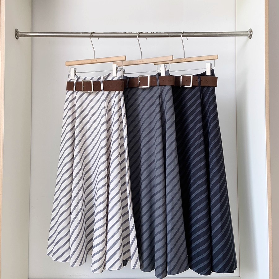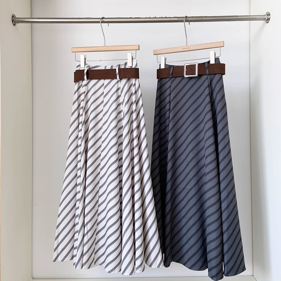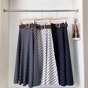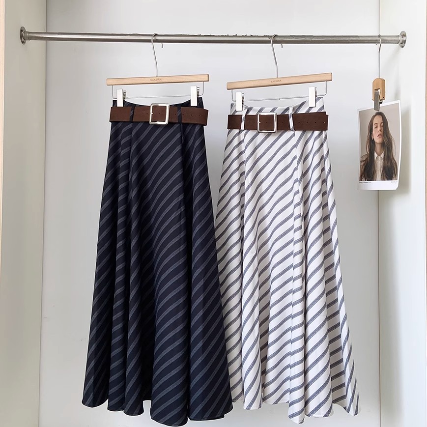 FA42942# 配腰带遮肉显瘦拼色条纹a字长裙女秋季新款百搭半身裙 服裝批發女裝批發服飾貨源