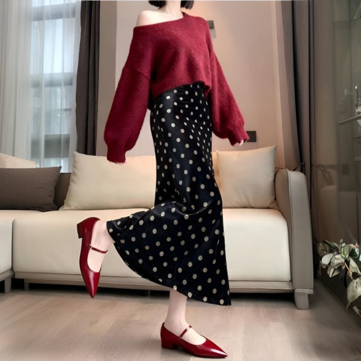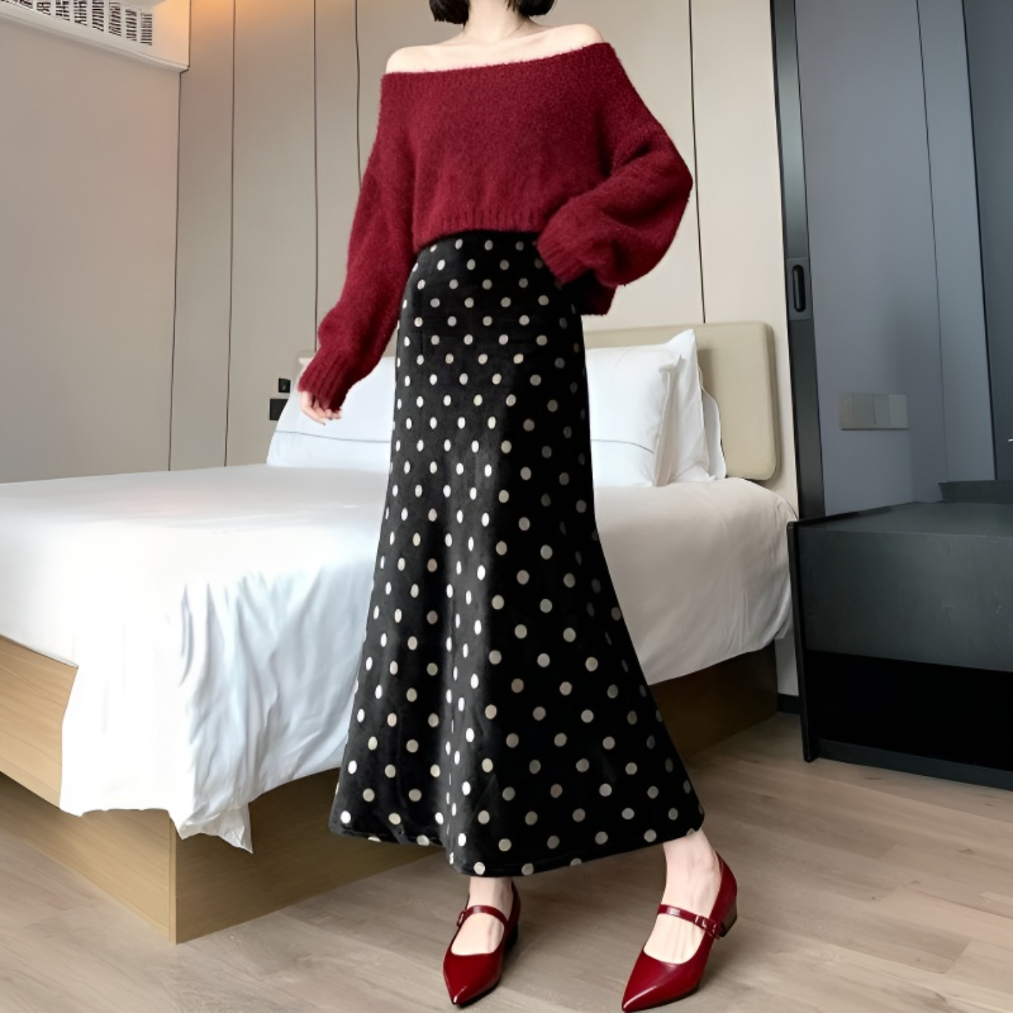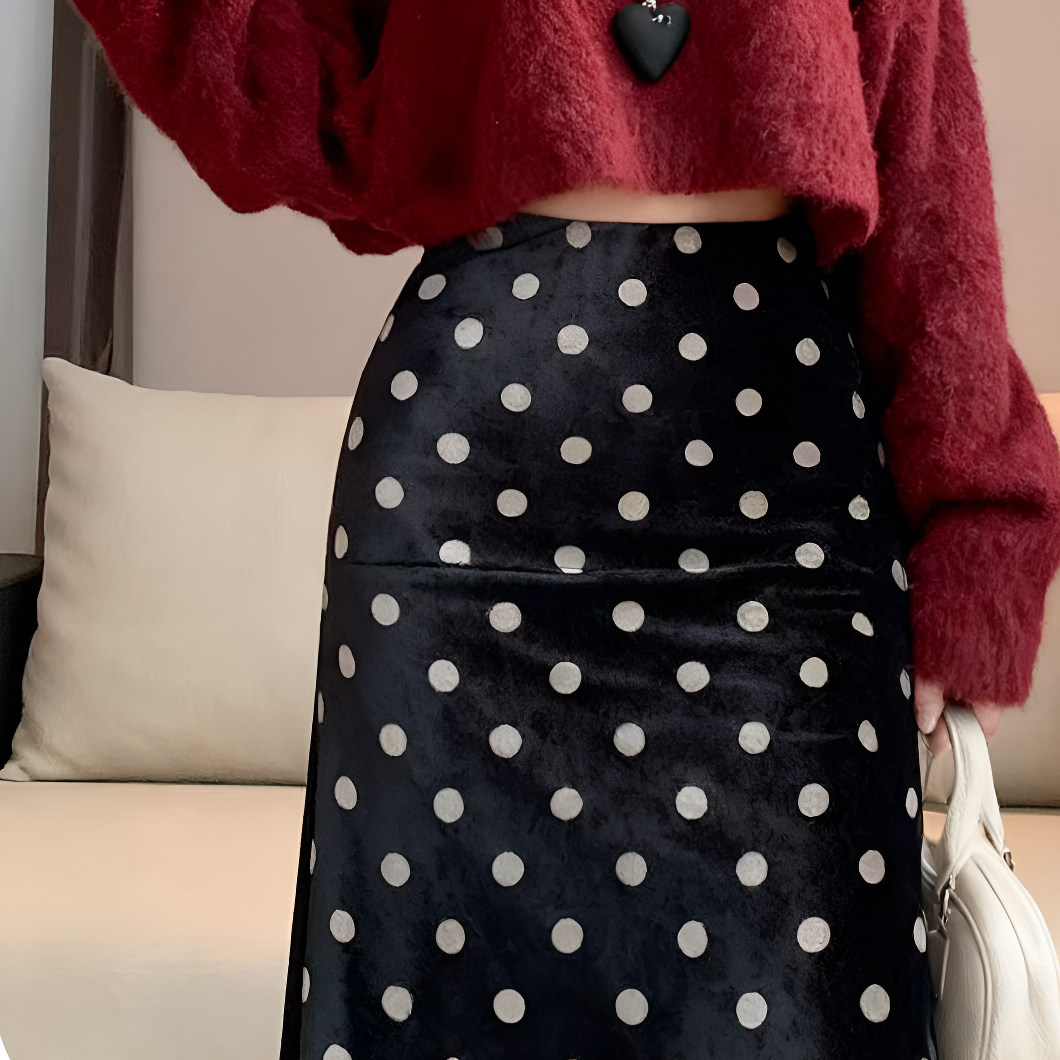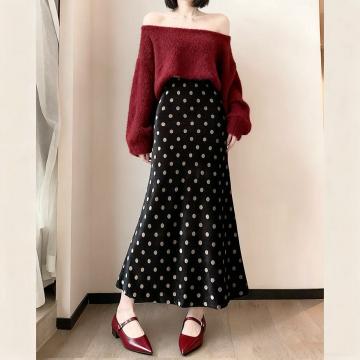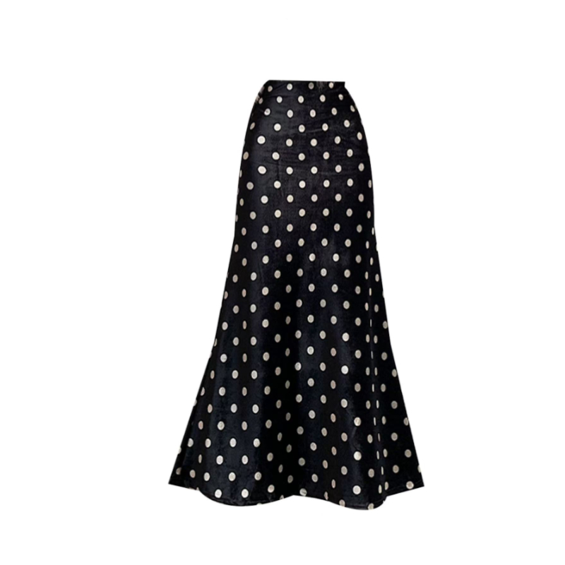 FA42943# 黑色波点丝绒鱼尾裙女秋季新款小个子a字裙高腰显瘦包臀长裙 服裝批發女裝批發服飾貨源
