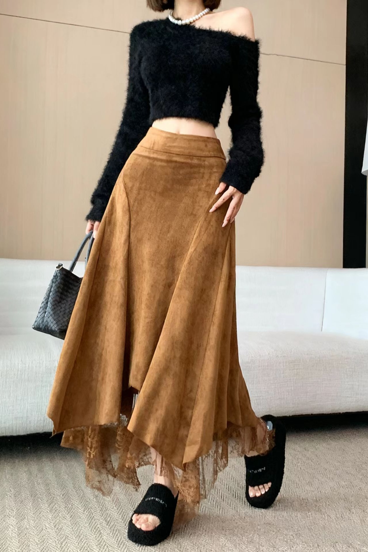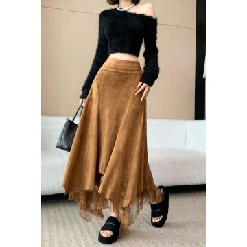 FA42944# 复古不规则半身裙秋冬款蕾丝拼接高腰设计显瘦洋气麂皮绒长裙 服裝批發女裝批發服飾貨源