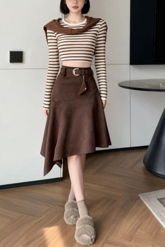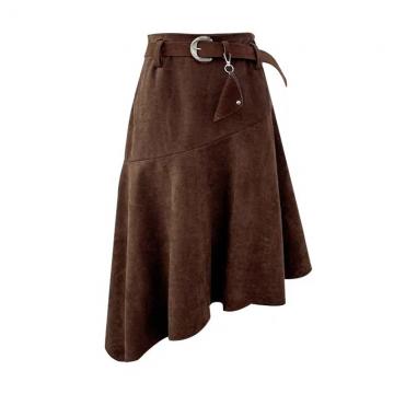 FA42945# 鹿皮绒不规则半身裙秋冬爆款设计感到膝盖遮肉炸街长短不齐a字裙 服裝批發女裝批發服飾貨源