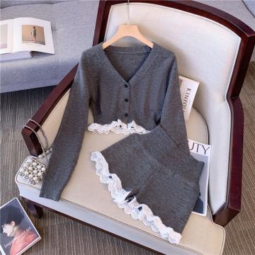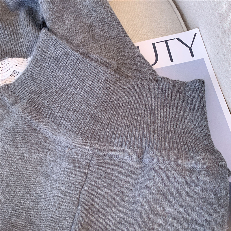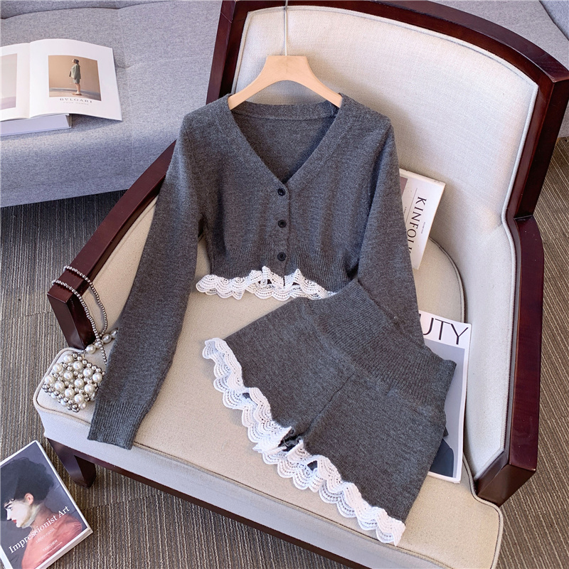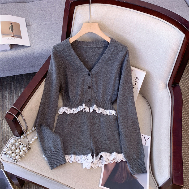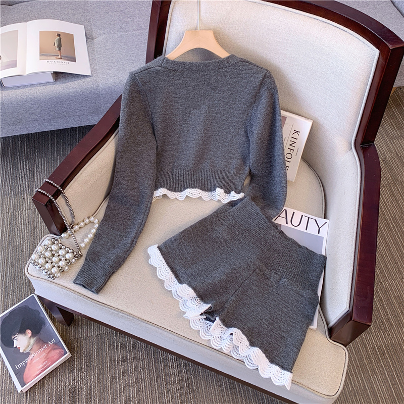 FA43007# 乖乖白蕾丝边长袖毛衣上衣短裤秋季灰色针织套装 服裝批發女裝批發服飾貨源