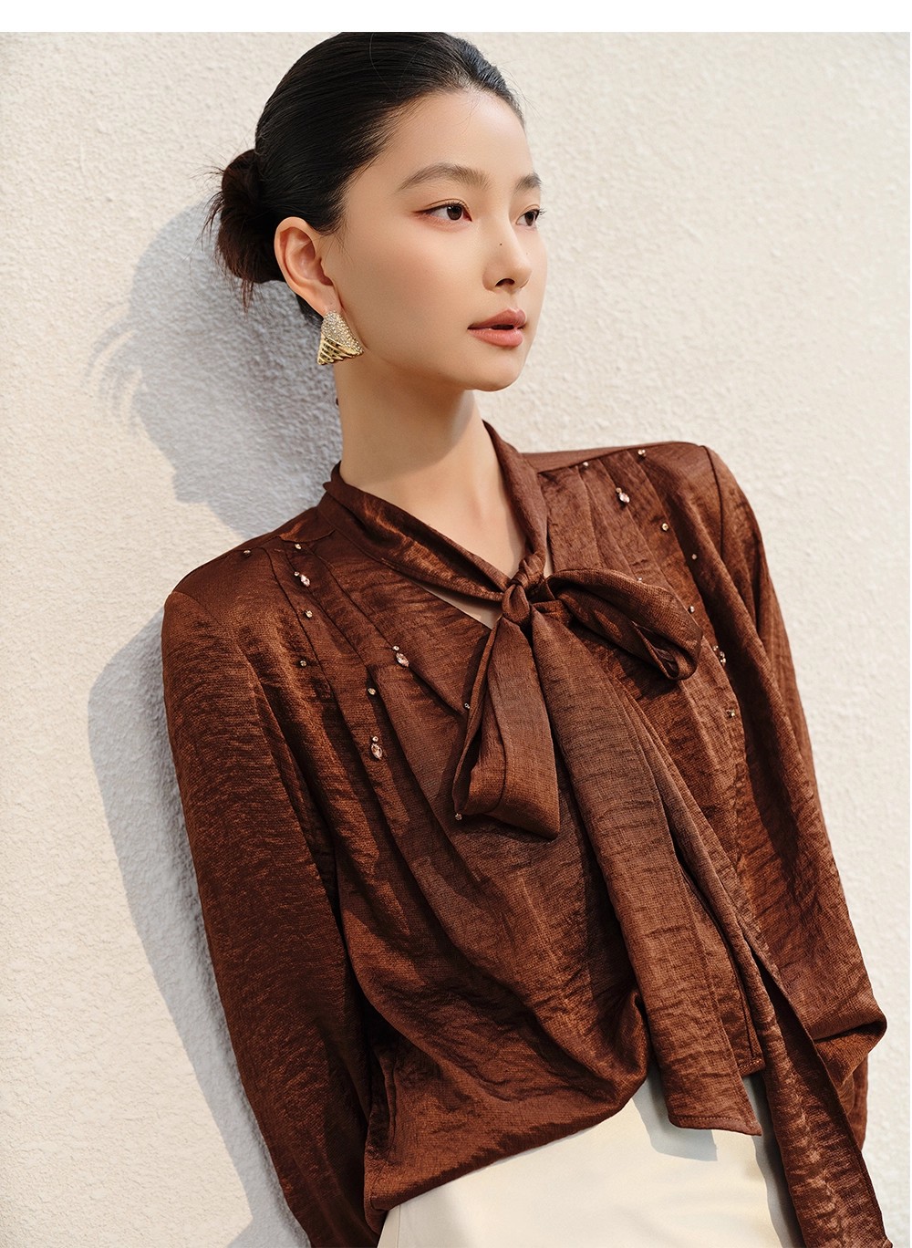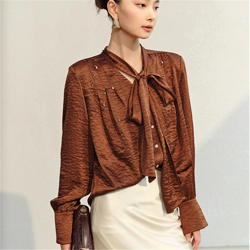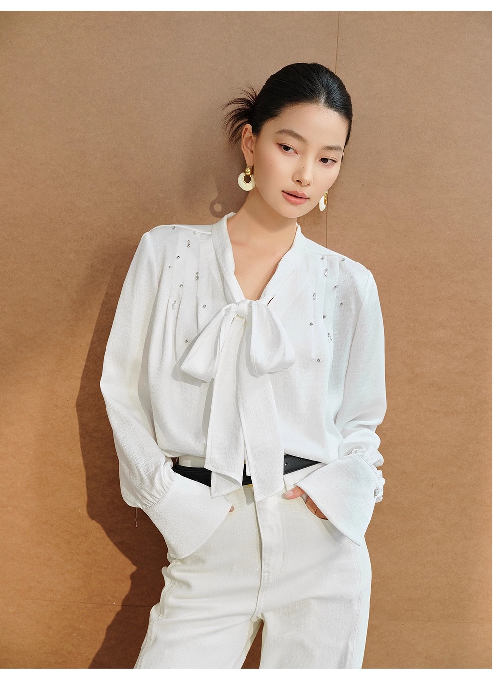FA43421# 星河早秋纯色宽松长袖衬衫蝴蝶结系带V领上衣女通勤 服裝批發女裝批發服飾貨源