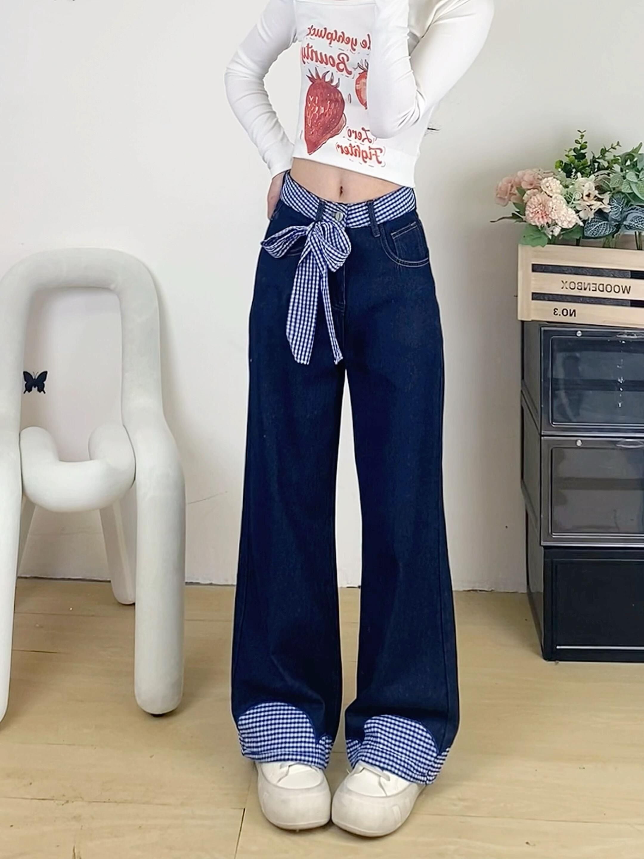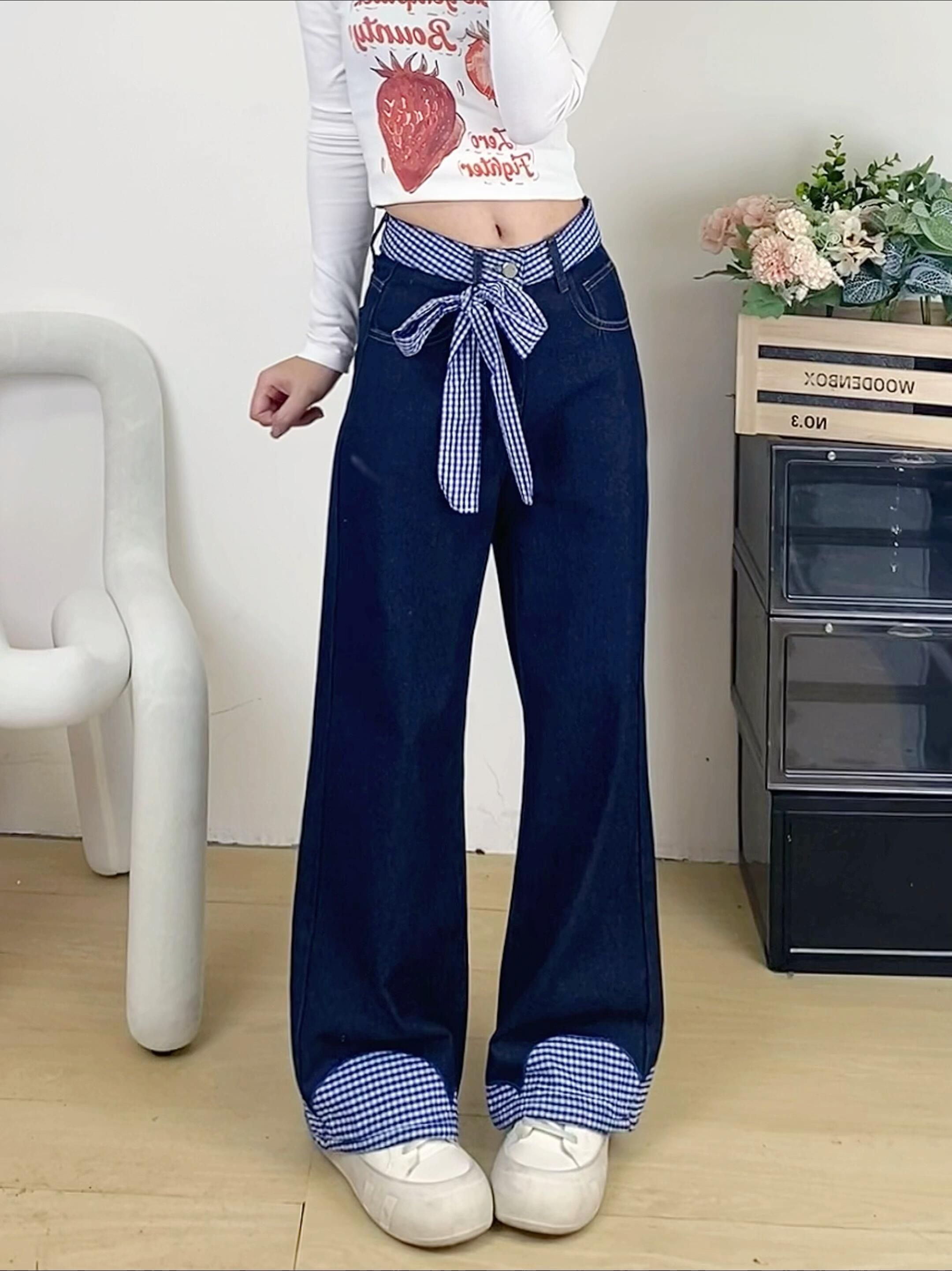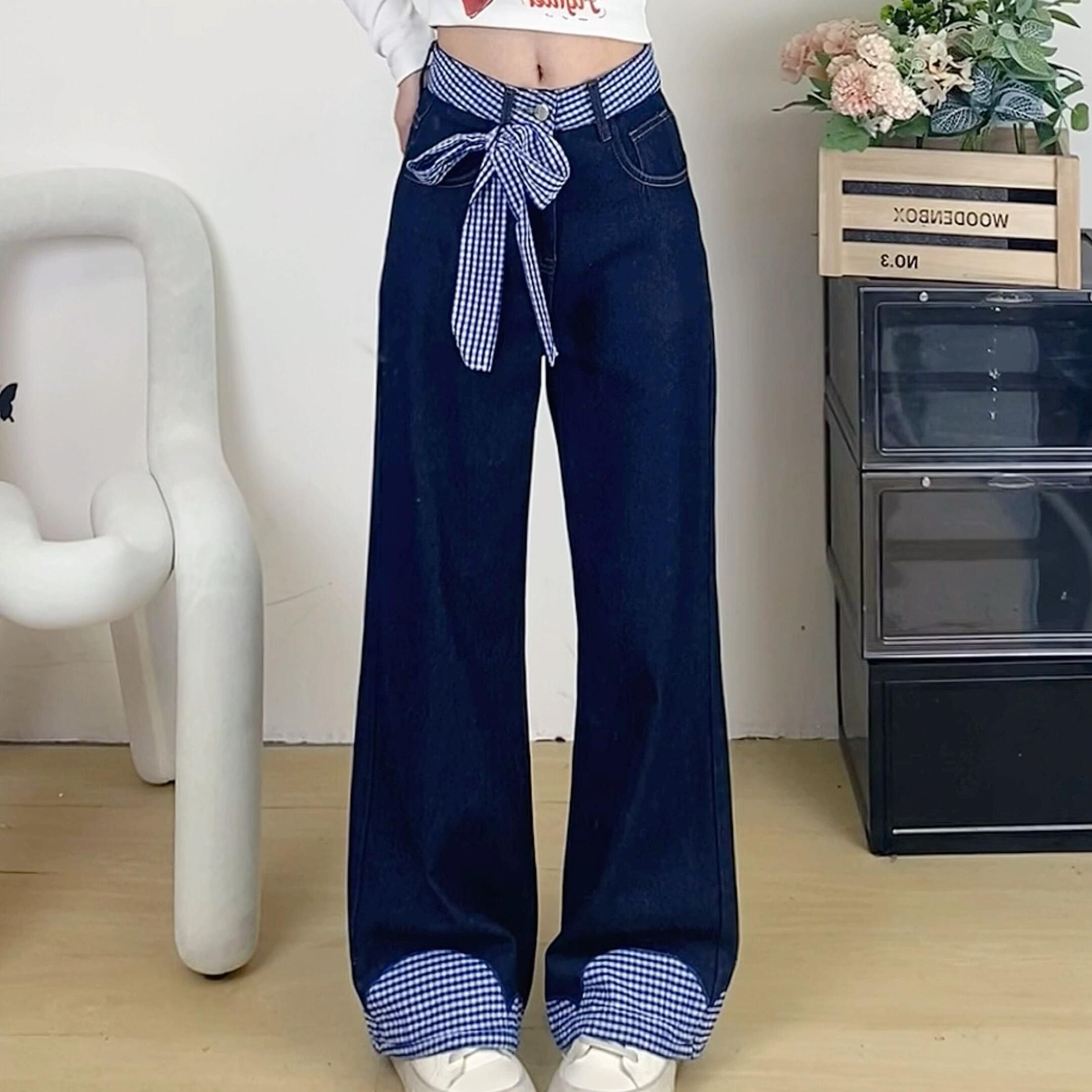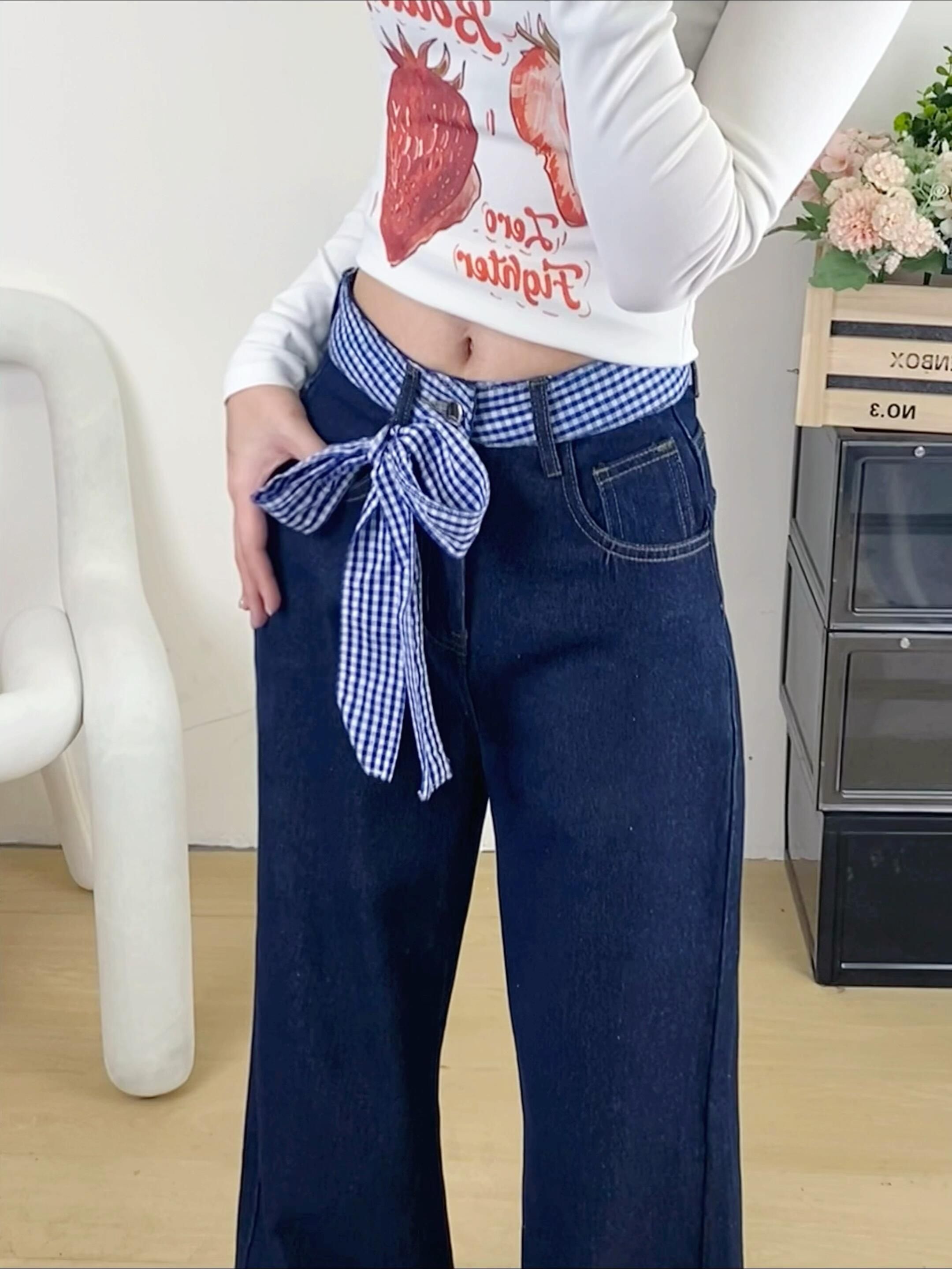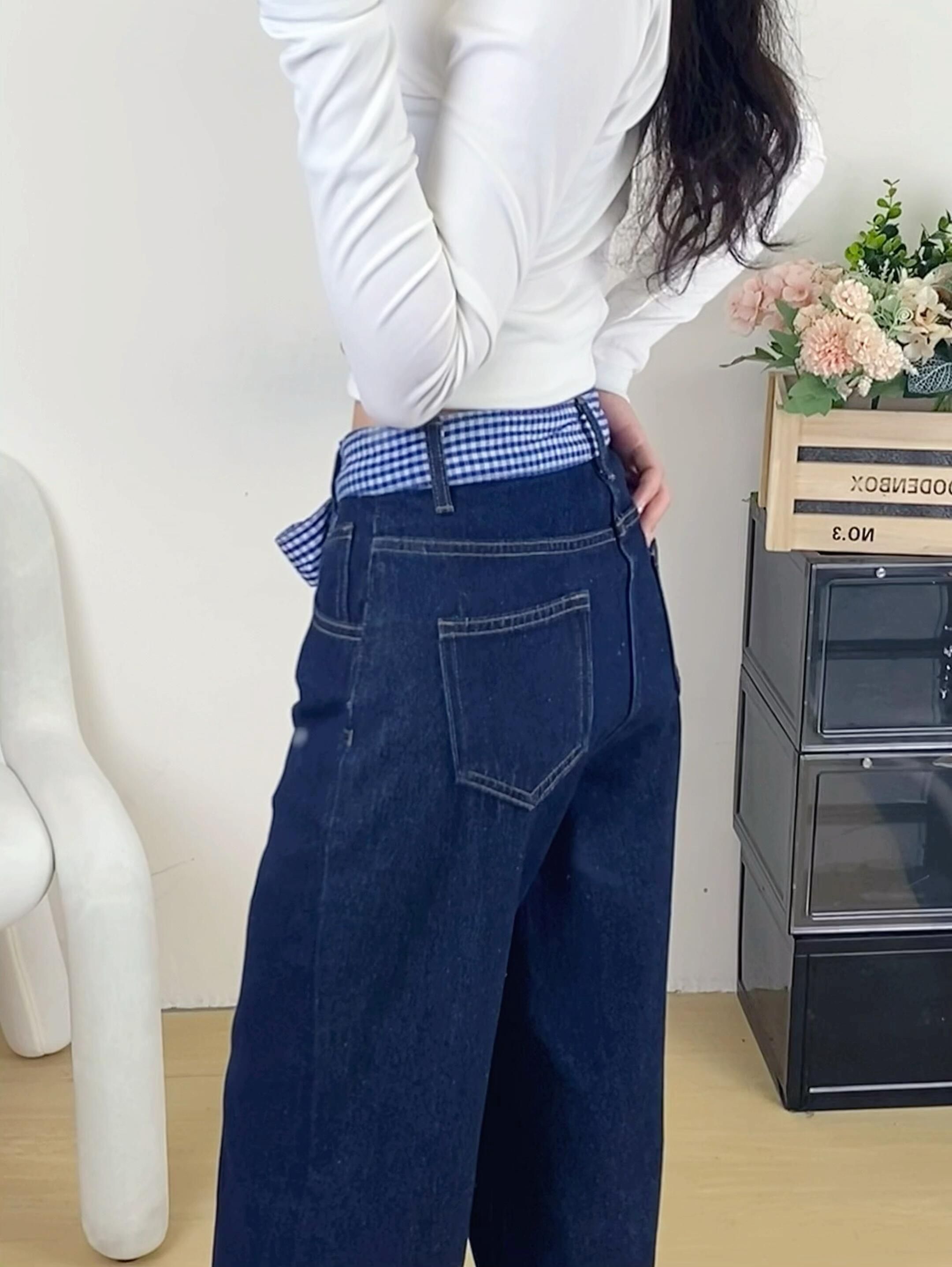 FA43427# 拼接牛仔裤女秋冬新款高腰显瘦深蓝色宽松阔腿裤拖地长裤子 服裝批發女裝批發服飾貨源