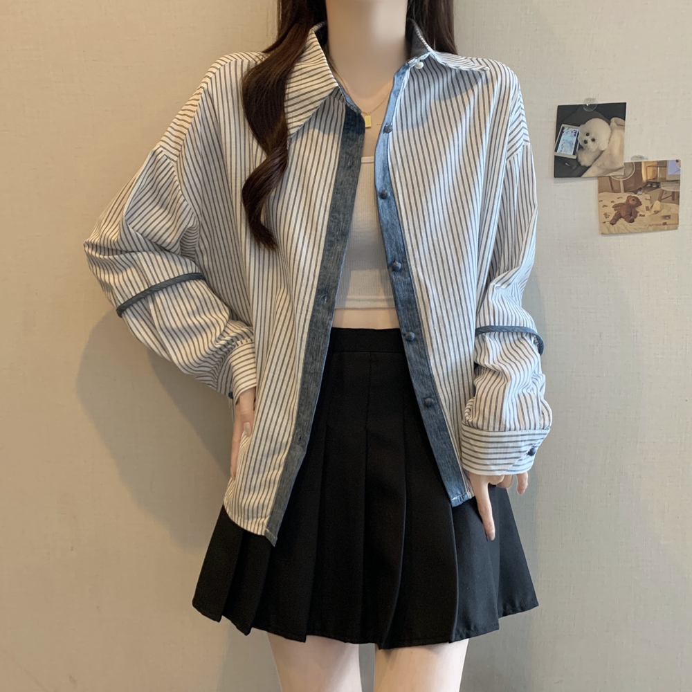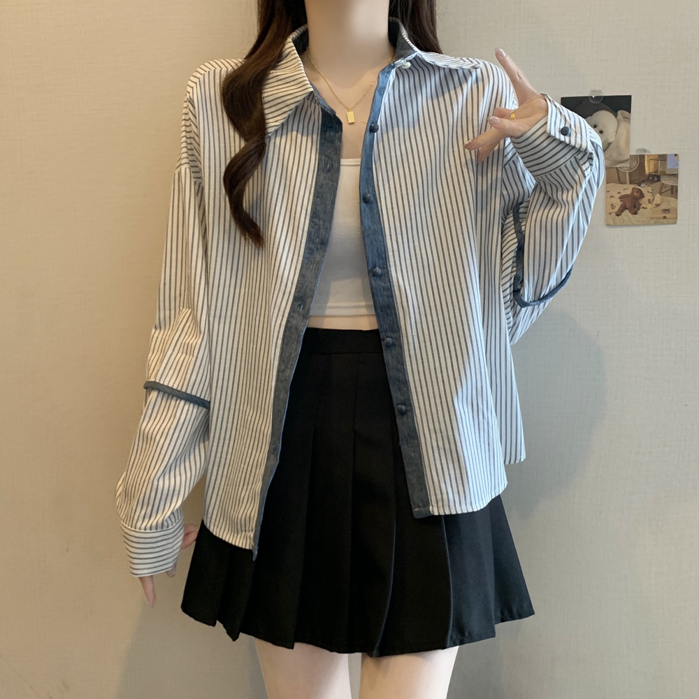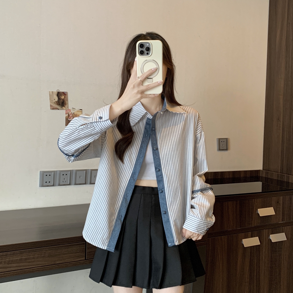 FA43537# 秋装新款日韩独特超好看蓝色条纹长袖衬衫小衫法式遮肉上衣 服裝批發女裝批發服飾貨源