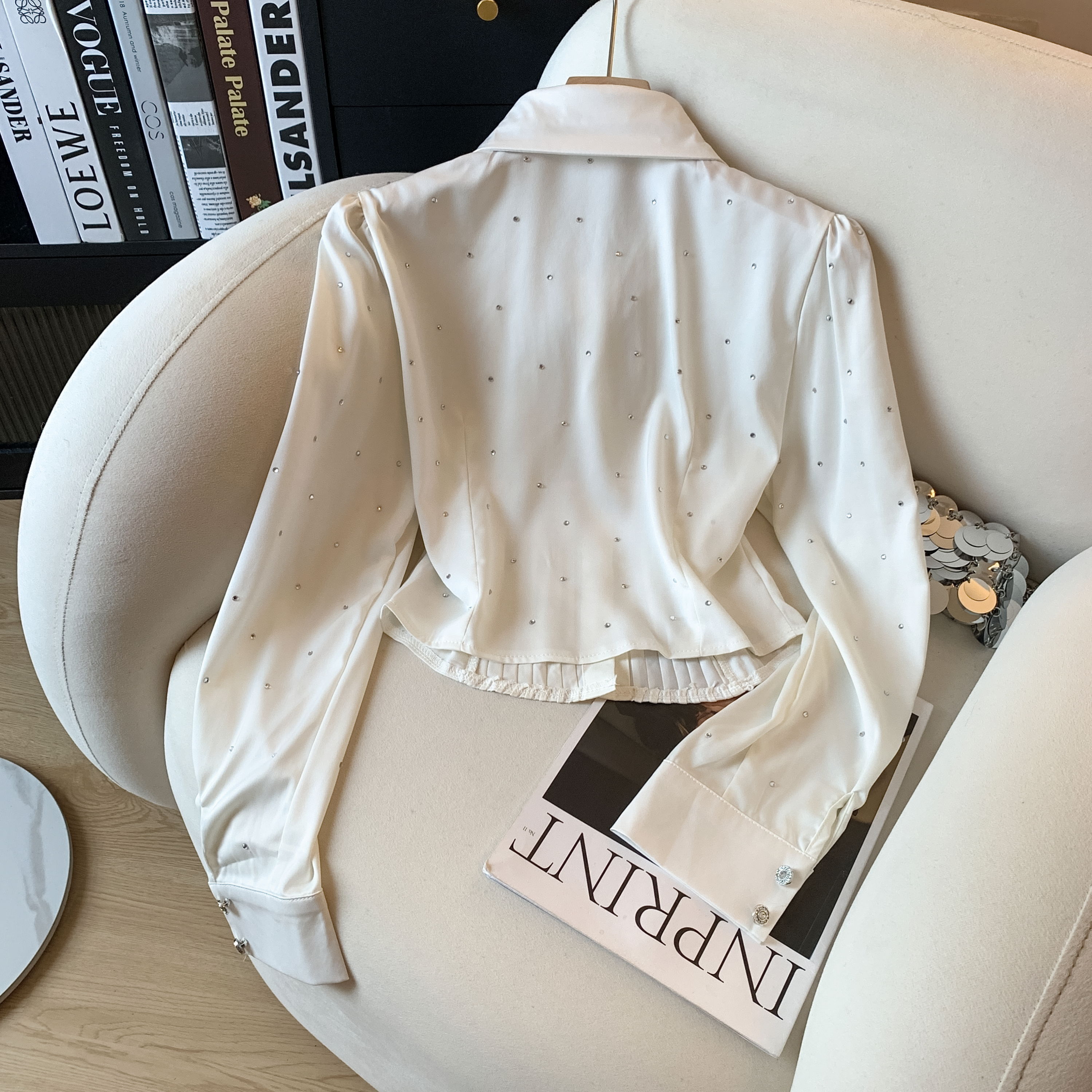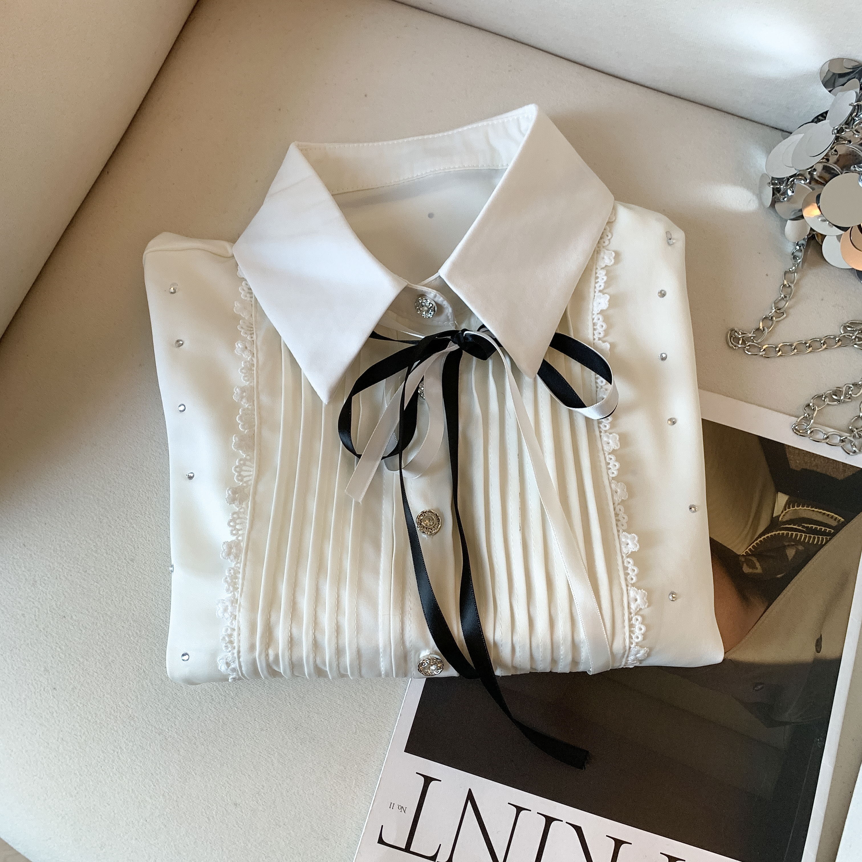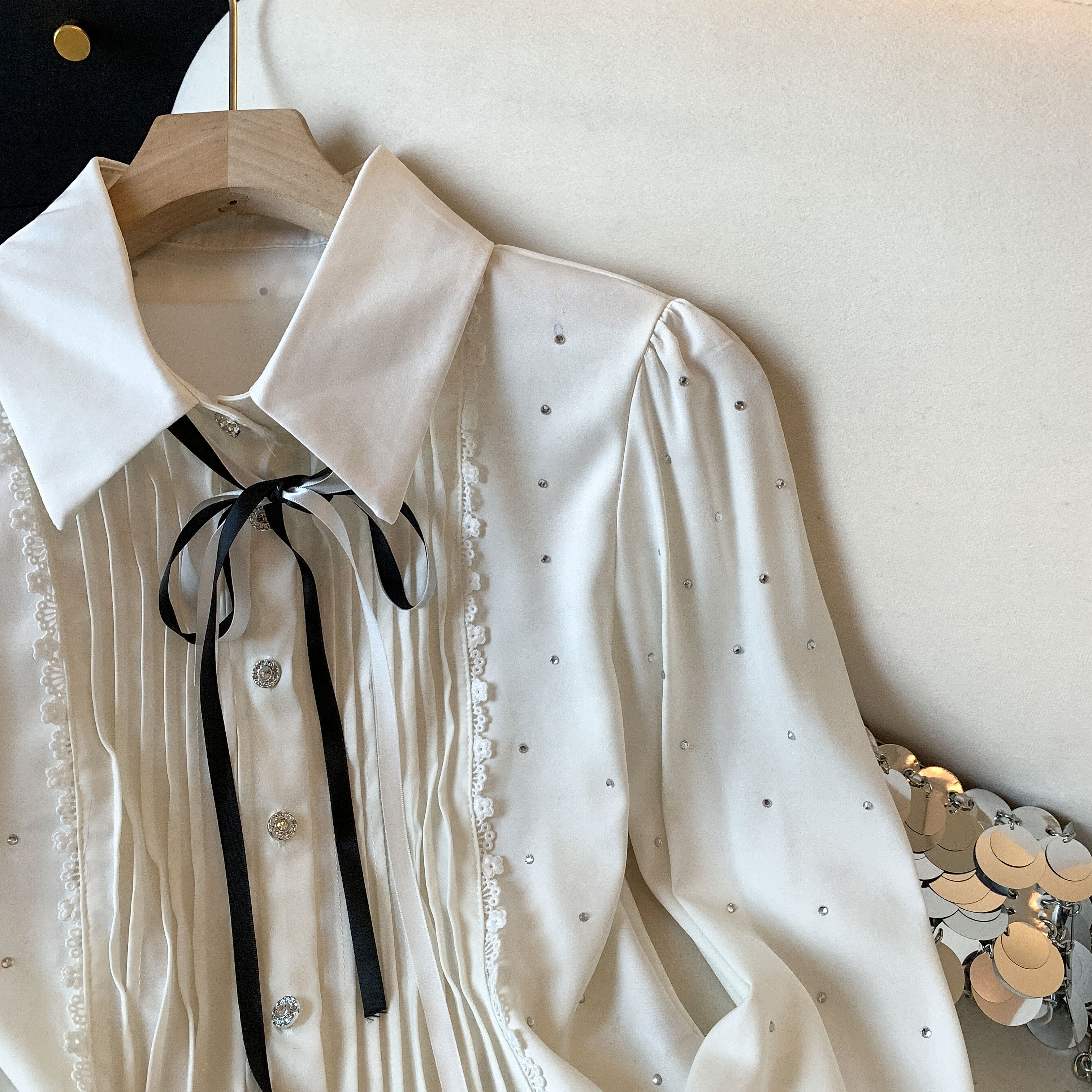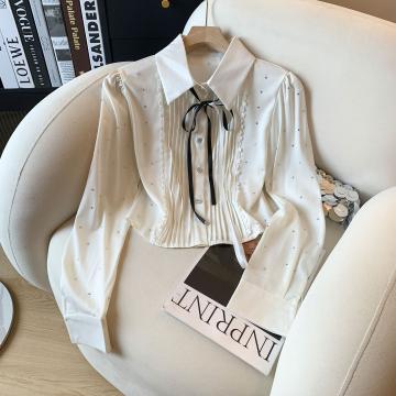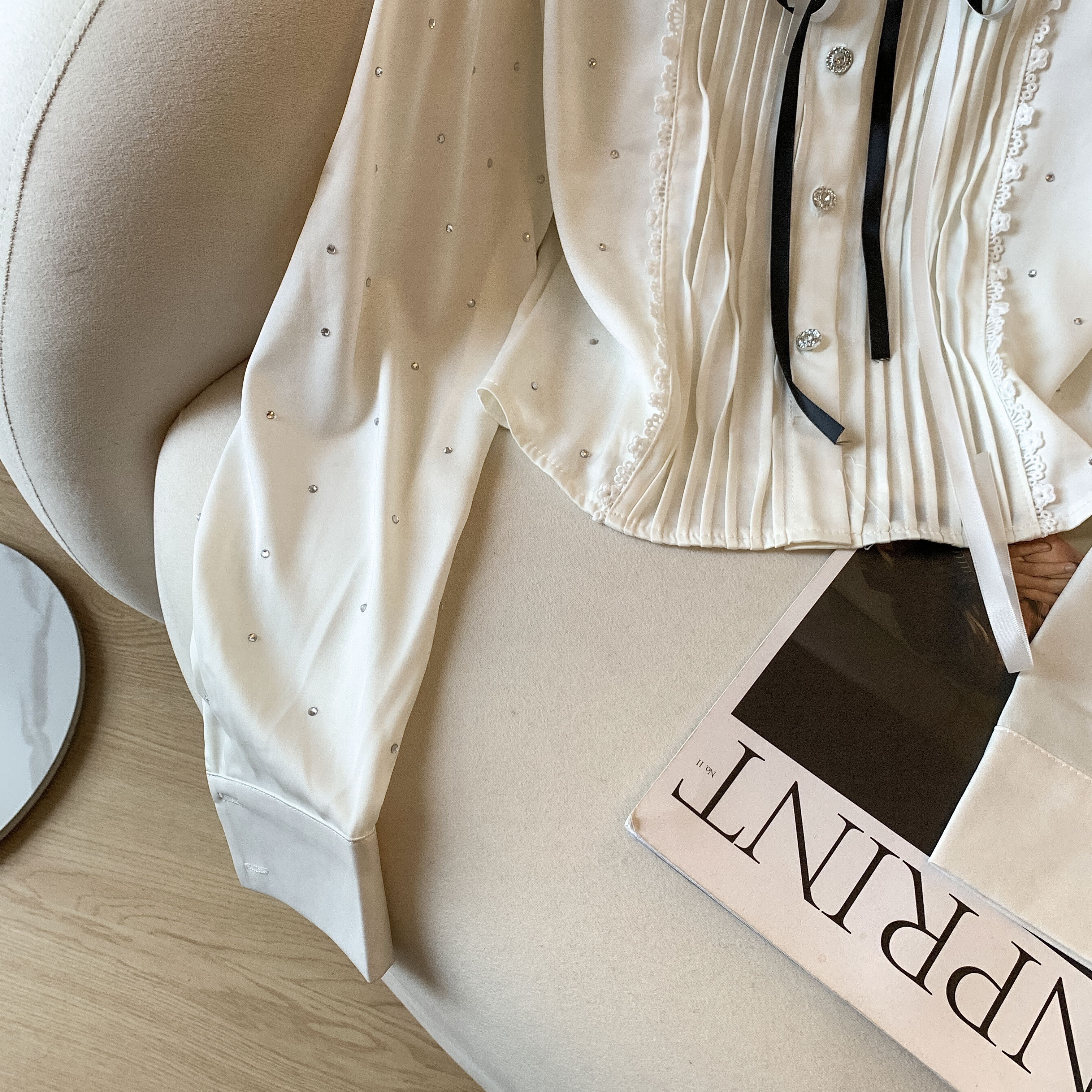 FA43546# 法式纯欲泡泡袖短款带钻闪闪衬衫宫廷风立领系带蝴蝶结衬衣 服裝批發女裝批發服飾貨源