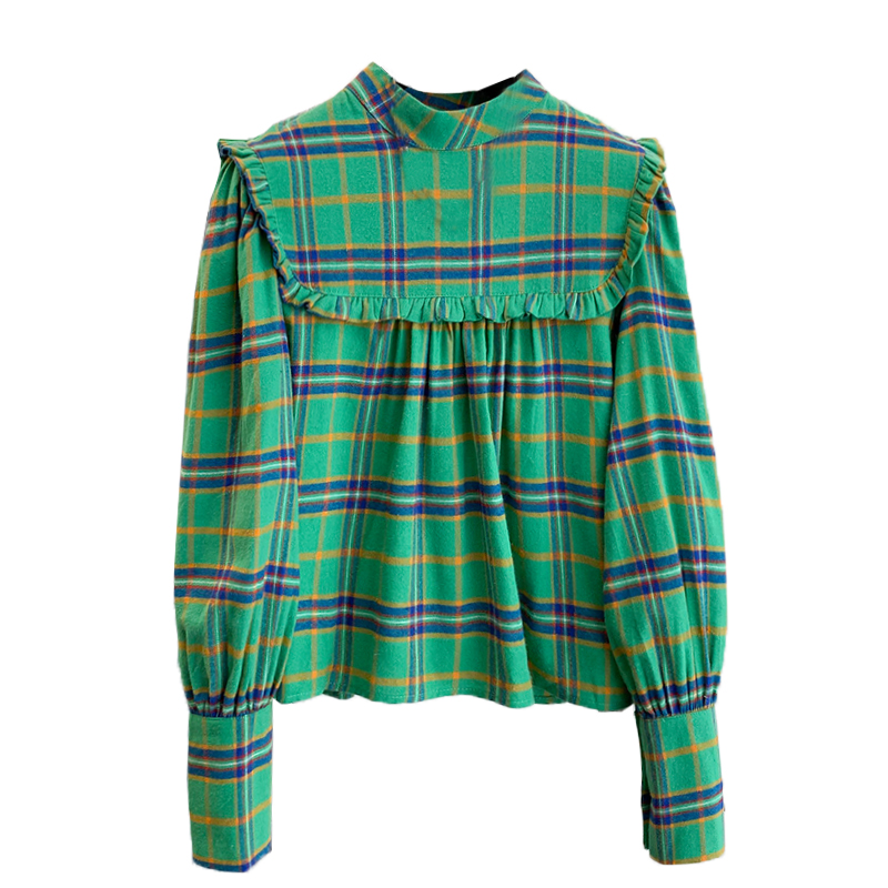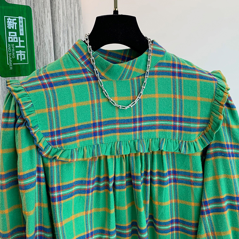 FA43553# 韩国chic复古荷叶边设计格纹休闲宽松长袖娃娃衫衬衫上衣 服裝批發女裝批發服飾貨源
