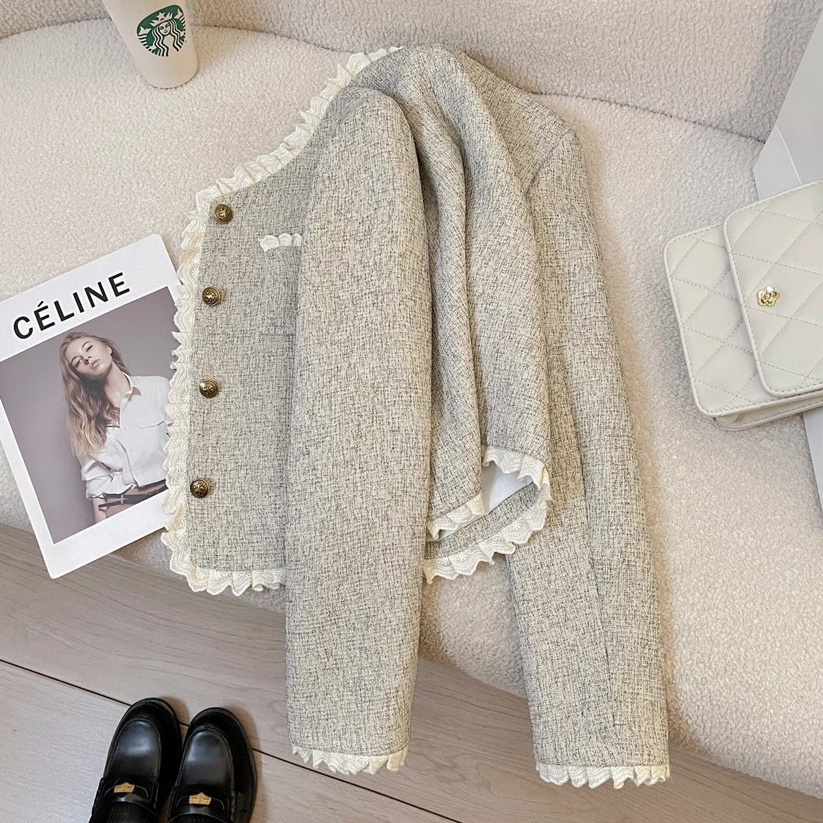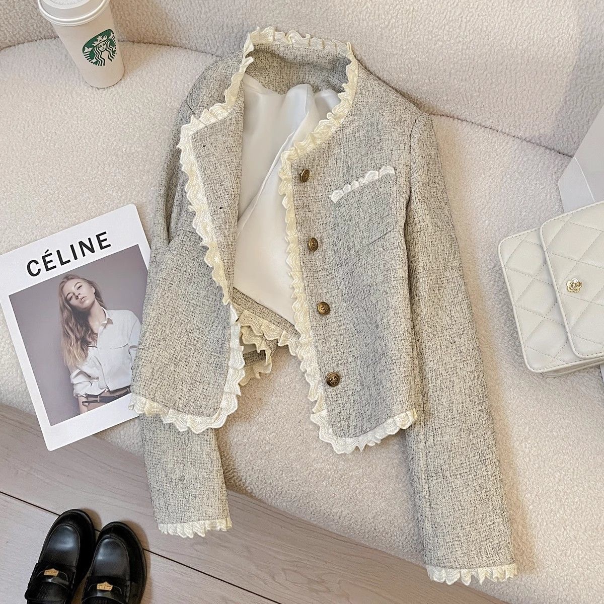 FA43592# 米灰色花边拼接小香风短外套女新款春季气质时尚超好看上衣潮 服裝批發女裝批發服飾貨源