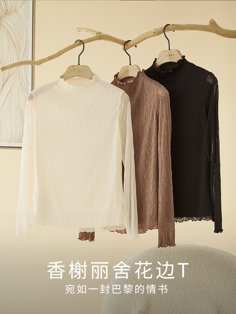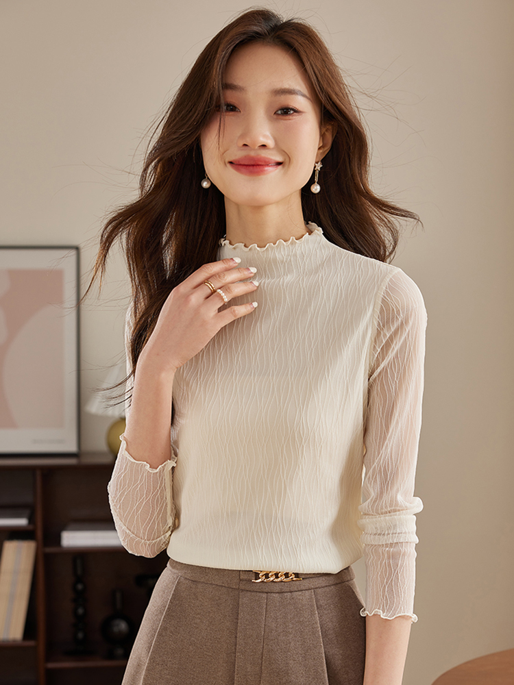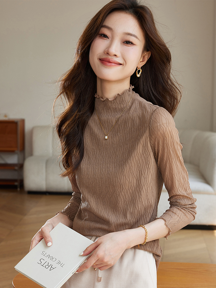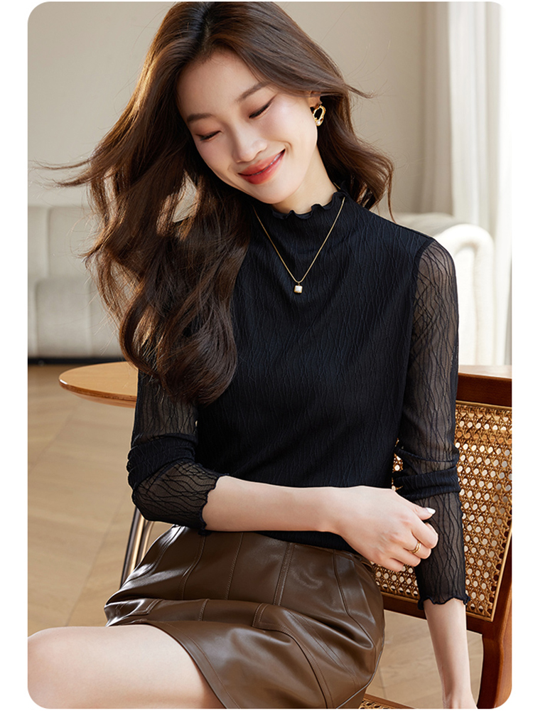 FA43611# 秋新款花边半高领内搭长袖T恤上衣肌理蕾丝打底衫女 服裝批發女裝批發服飾貨源