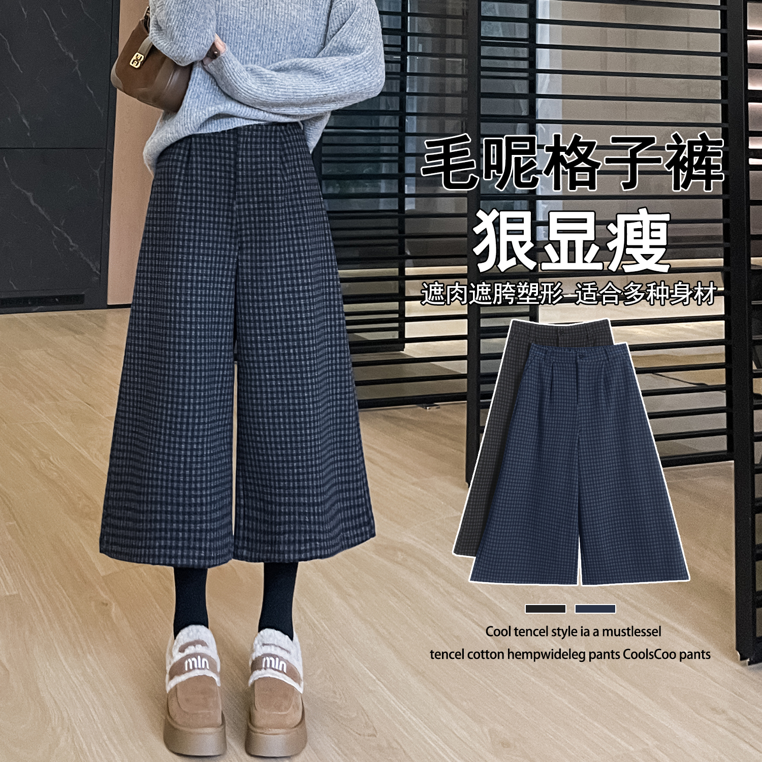 FA43849# 加厚格子毛呢八分阔腿裤秋冬新款宽松百搭显瘦休闲裤 服裝批發女裝批發服飾貨源