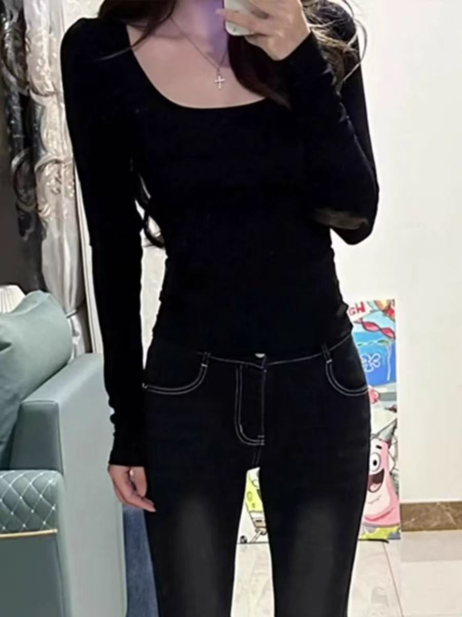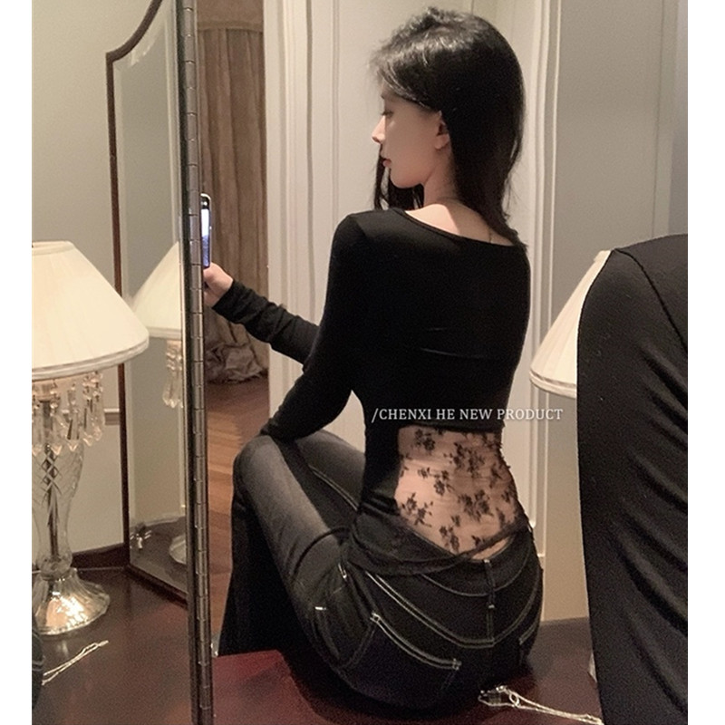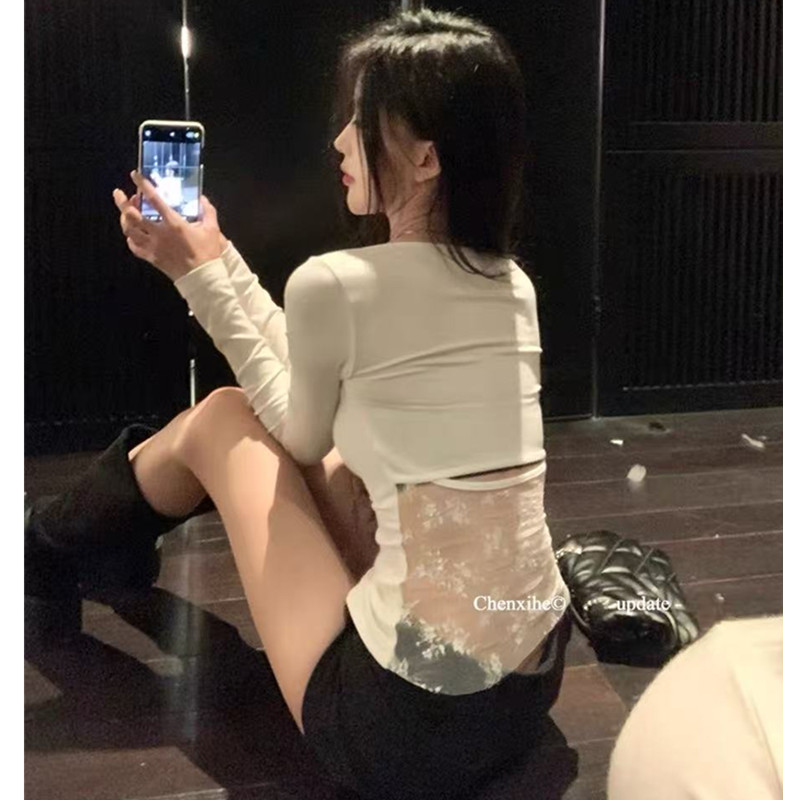 FA43869# 非不减蕾丝打底设计感长袖上衣秋季纯欲后背镂空性感内搭T恤 服裝批發女裝批發服飾貨源