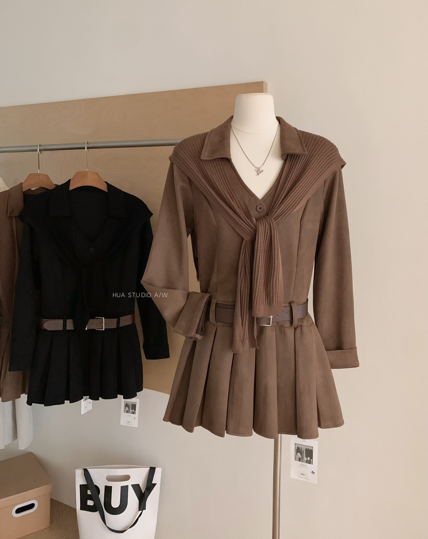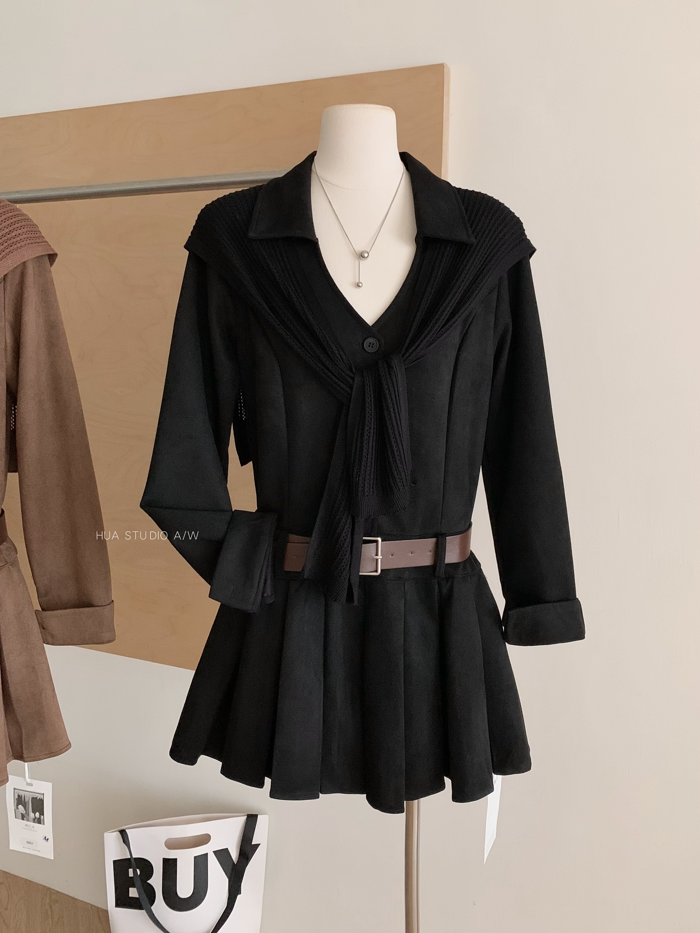 FA43875# 美式复古翻领长袖鹿皮绒连衣裙女秋冬新款收腰修身短裙配披肩腰带 服裝批發女裝批發服飾貨源