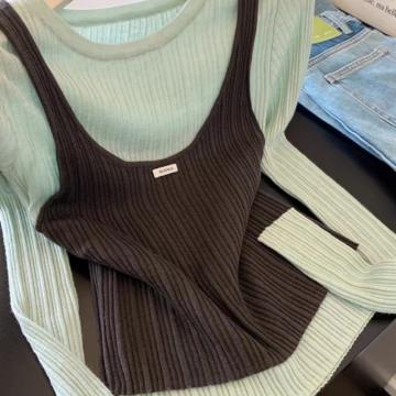 FA43882# 早秋韩系撞色假两件圆领针织衫女氛围感穿搭修身长袖上衣 服裝批發女裝批發服飾貨源