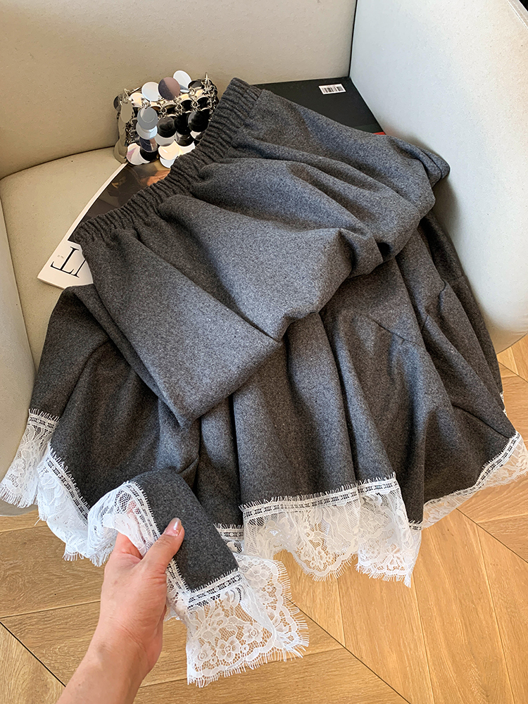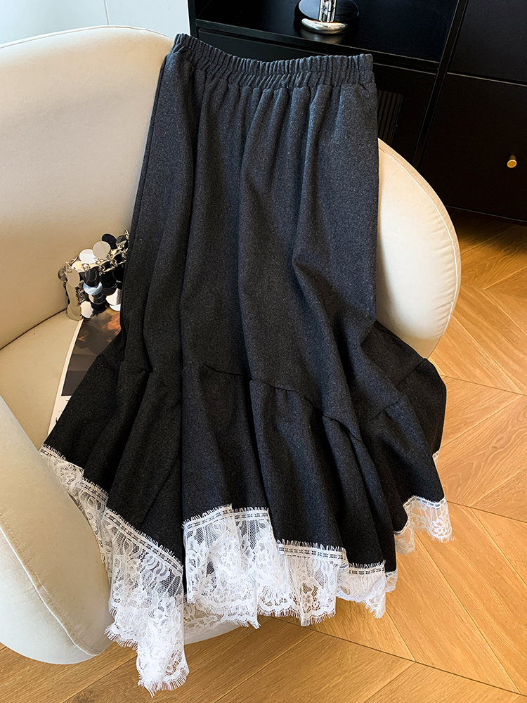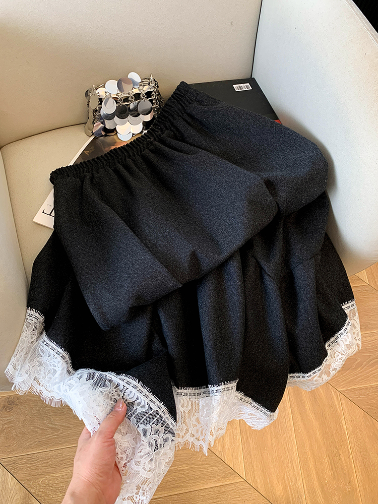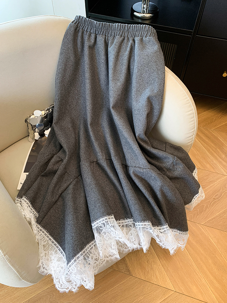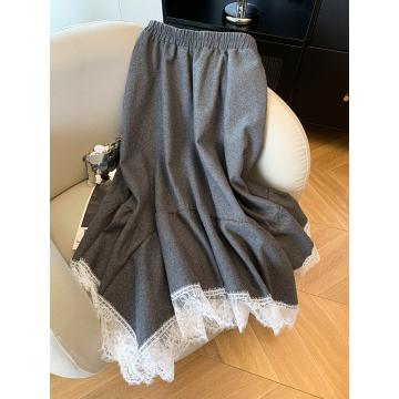 FA44189# 时尚气质不规则蕾丝拼接半身裙女秋季小众洋气a字毛呢中长裙 服裝批發女裝批發服飾貨源