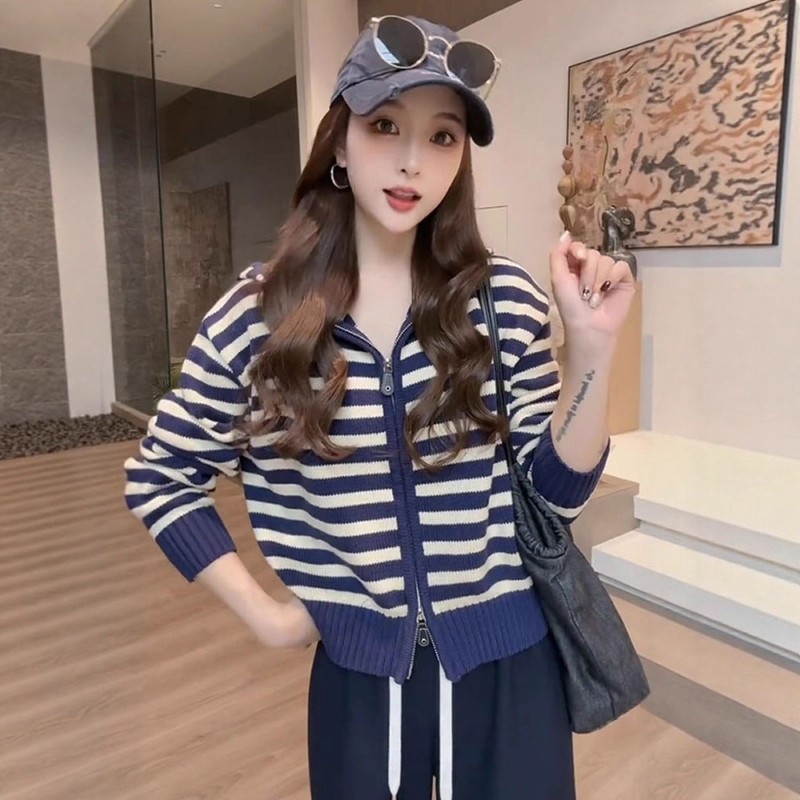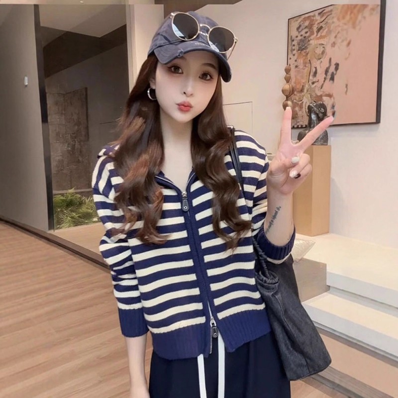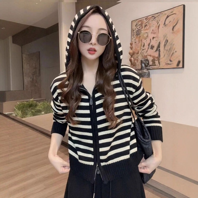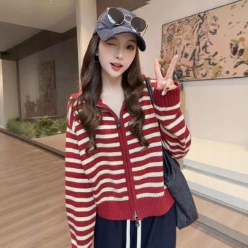FA44426# 秋季穿搭撞色条纹连帽针织衫女新款时尚洋气减龄毛衣开衫外套 服裝批發女裝批發服飾貨源