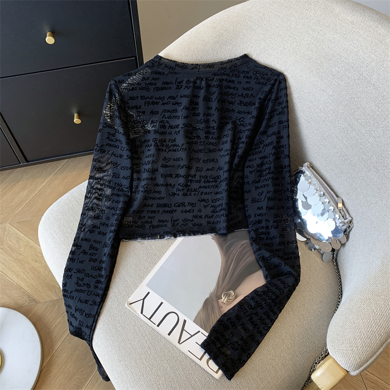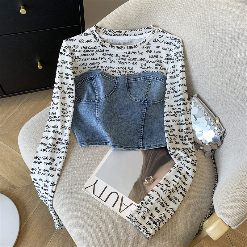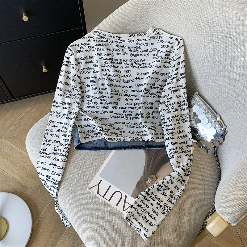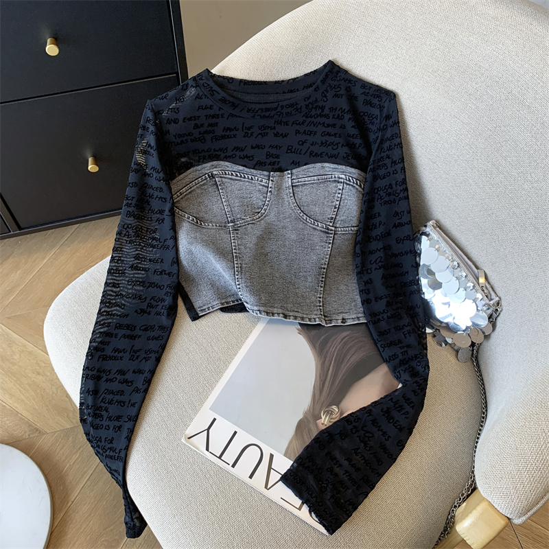 FA44455# 甜酷辣妹短款牛仔网纱拼接上衣女长袖t恤小衫 服裝批發女裝批發服飾貨源
