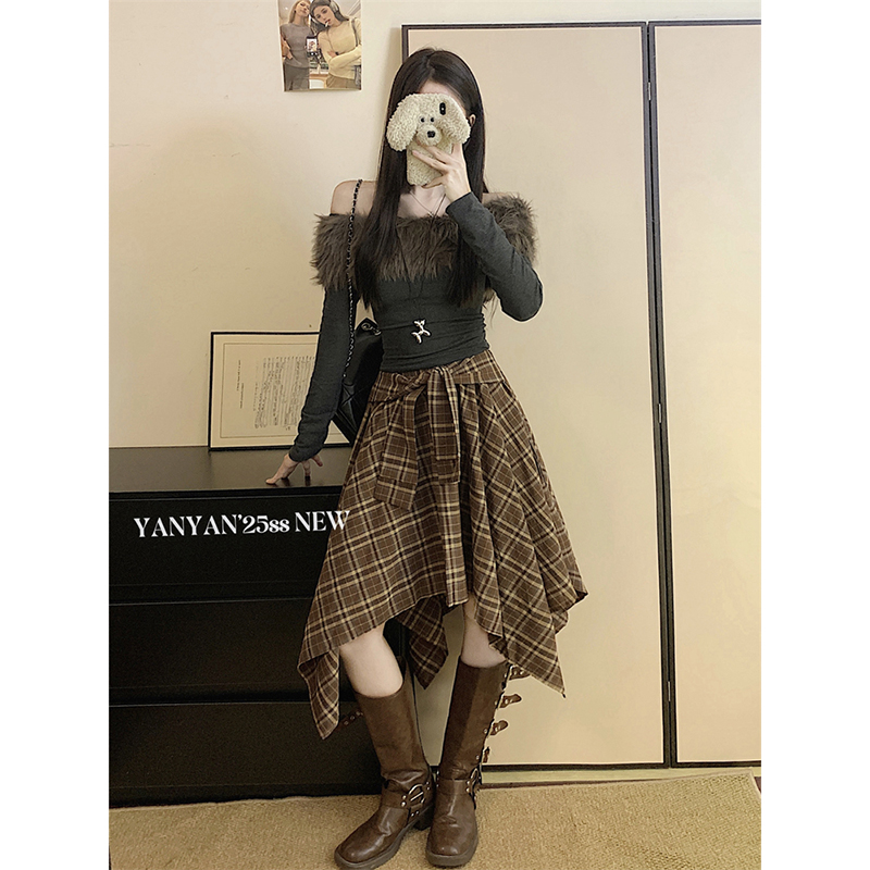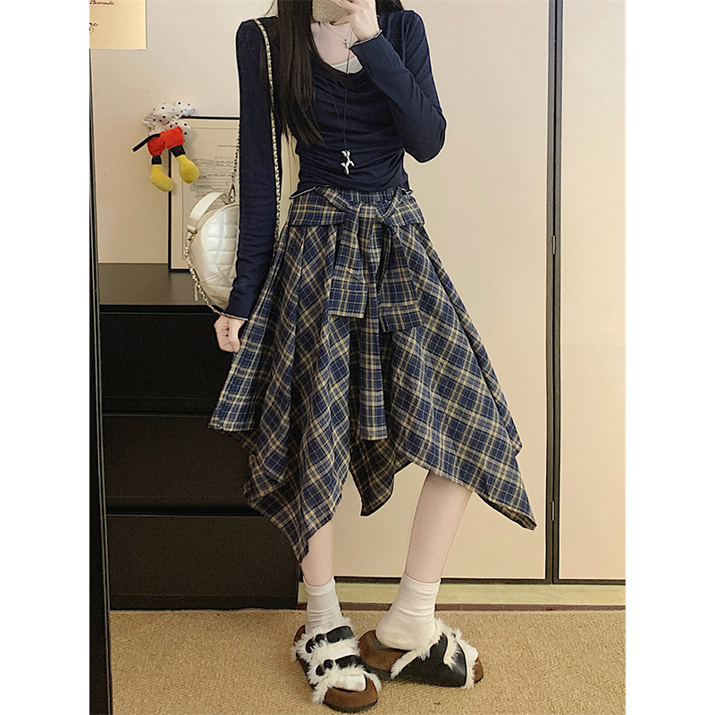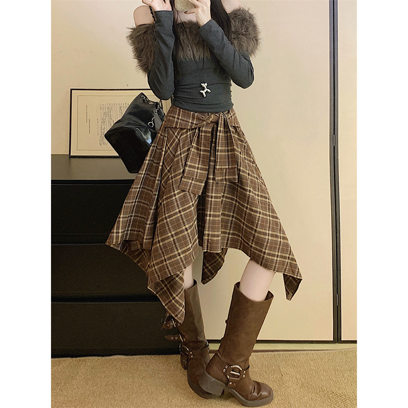FA44490# 显瘦格子不规则秋季新款韩系时尚绑带设计感半身裙女 服裝批發女裝批發服飾貨源
